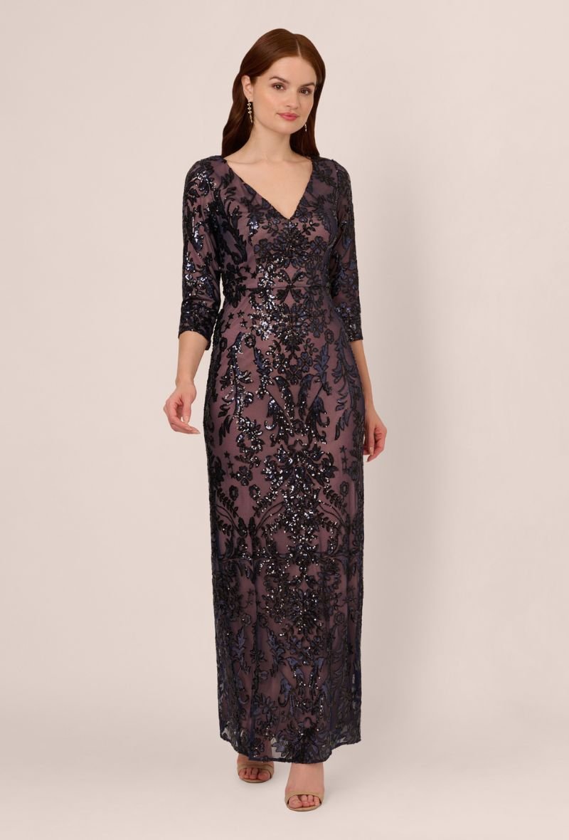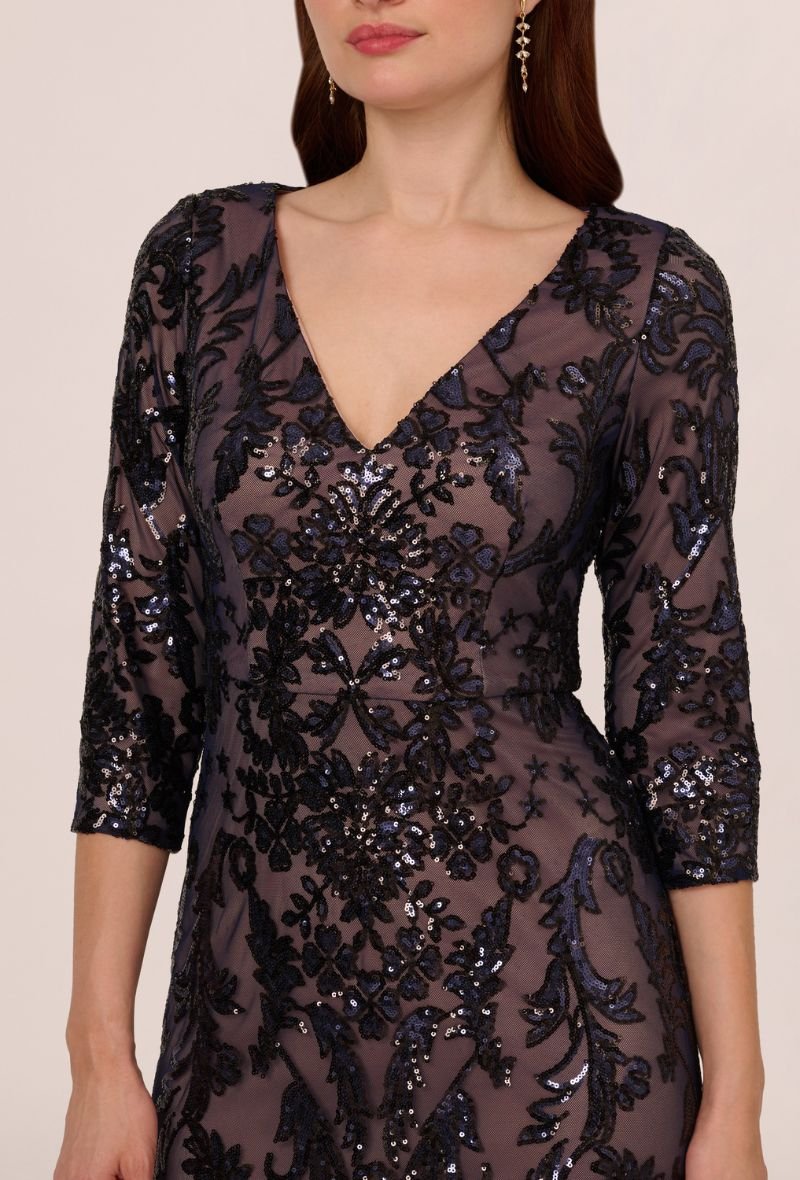 Maak een onvergetelijke indruk met deze schitterende avondjurk van Adrianna Papell. De jurk is rijkelijk versierd met handgemaakte pailletten en kralen in navy en roségoud, die een betoverend patroon vormen. De elegante V-halslijn en driekwartmouwen zorgen voor een vrouwelijke en verfijnde uitstraling.