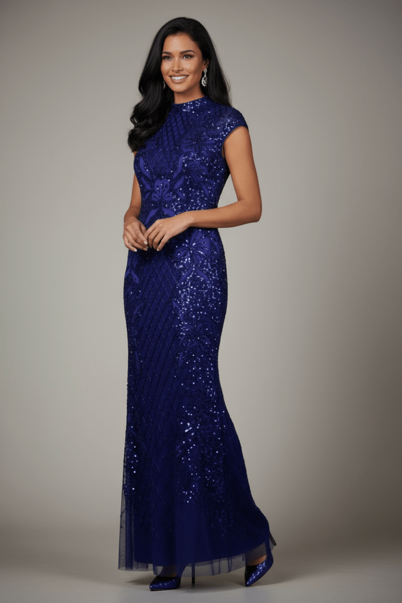 De nauwsluitende pasvorm en het semi-transparante meshdesign creëren een tijdloos silhouet dat zowel elegant als modern is. Perfect voor een gala, bruiloft of een bijzonder avondfeest.