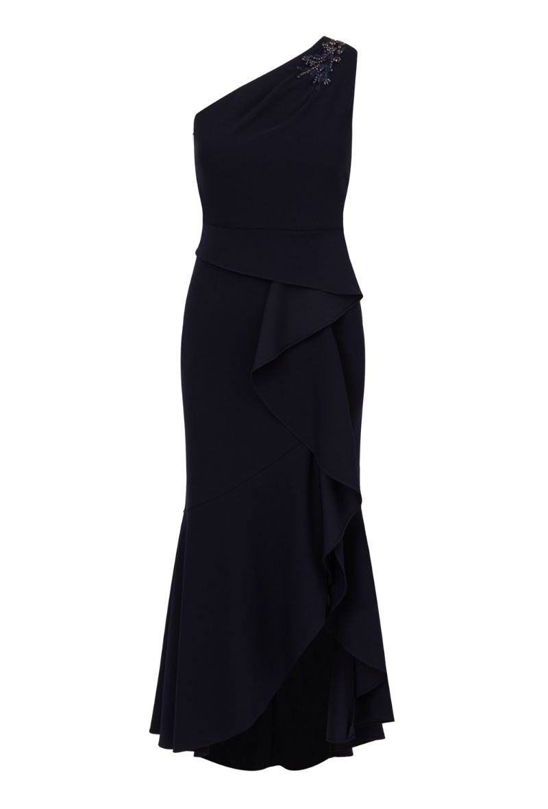 Het ontwerp heeft een asymmetrische one-shoulder halslijn, versierd met schitterende kralendecoraties die het geheel een glamoureuze touch geven. De gelaagde volant en de speelse, golvende zoomlijn creëren een flatterende en vrouwelijke look.