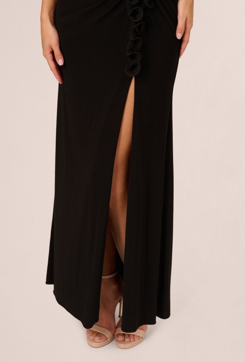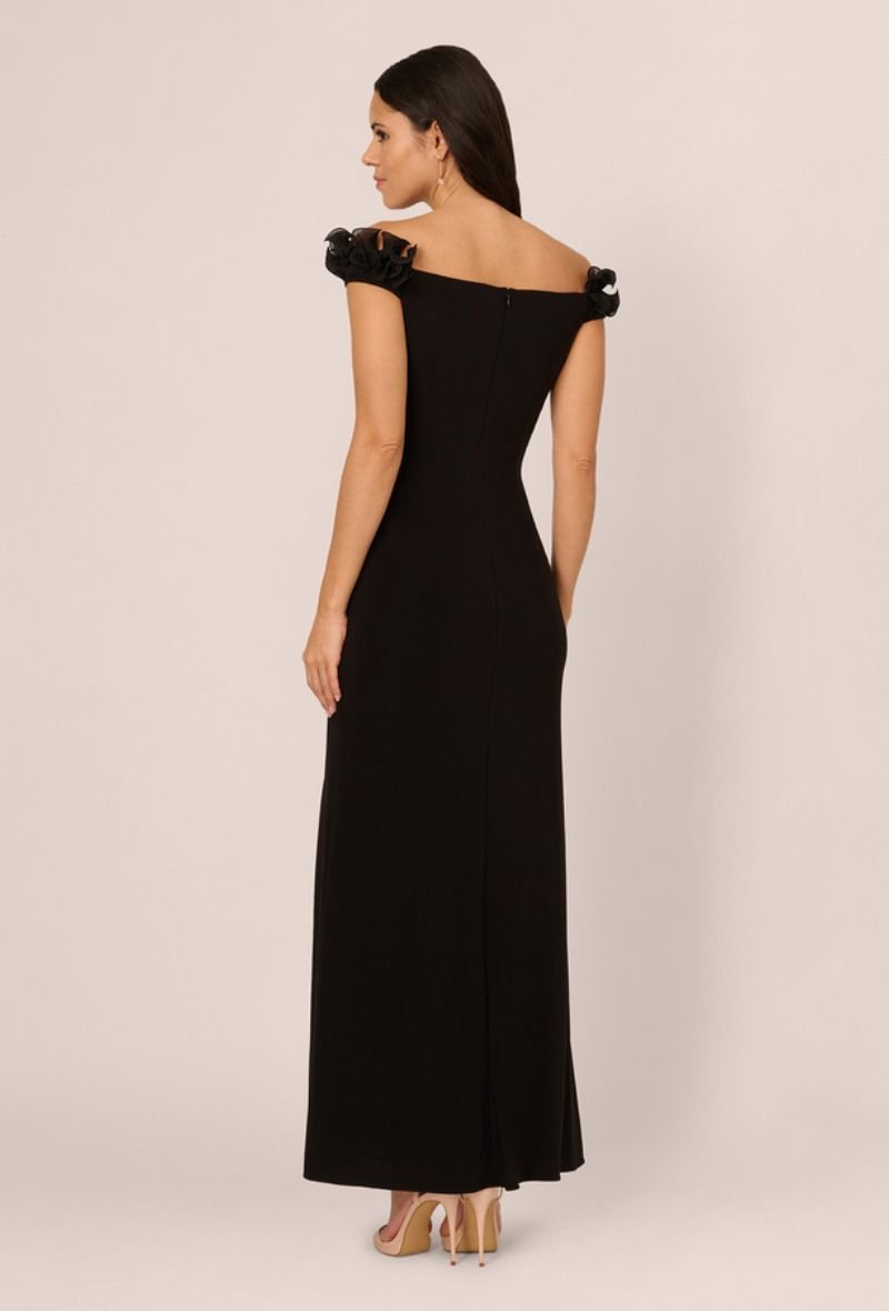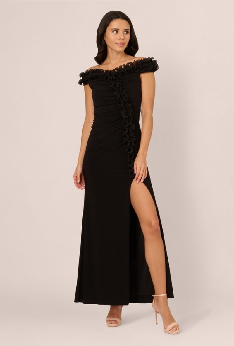 Deze prachtige zwarte avondjurk van Adrianna Papell is een ultieme mix van verfijnde glamour en vrouwelijke elegantie. De off-shoulder halslijn met unieke bloemapplicaties en de verleidelijke split zorgen voor een onvergetelijke look.