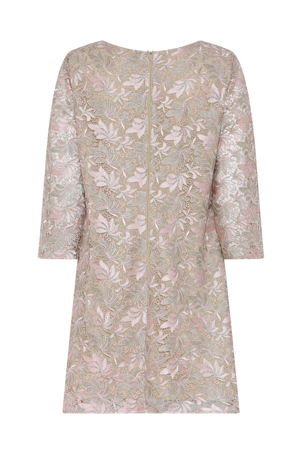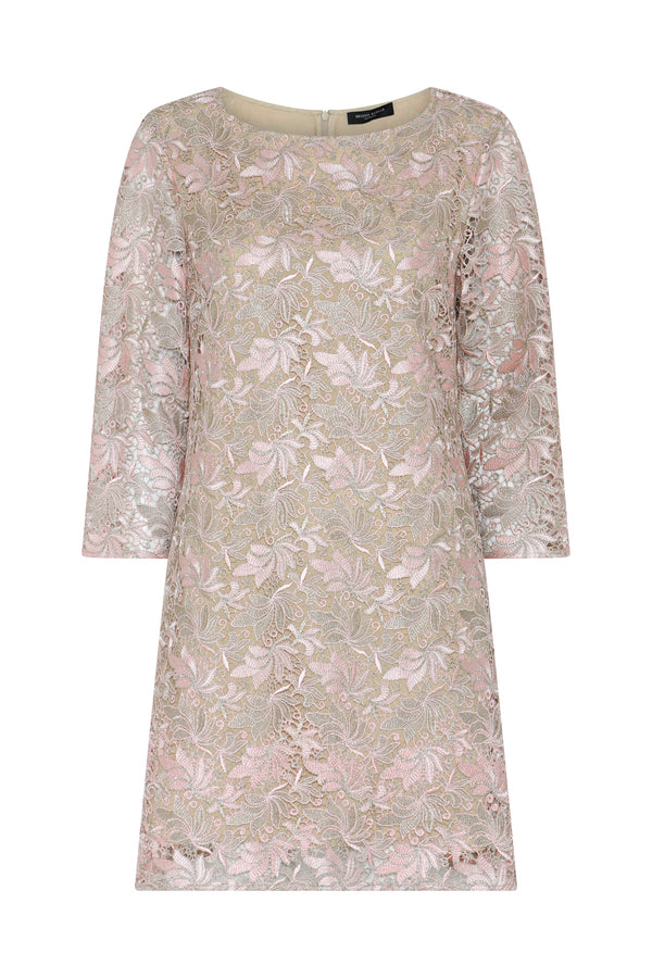 Deze elegante jurk is een verfijnde keuze voor bijzondere gelegenheden. Het model is volledig uitgevoerd in een rijk geborduurde kantkwaliteit met een romantisch bloemenmotief in zachte rosé- en goudtinten. De subtiele glans van het borduurwerk geeft de jurk een luxe uitstraling, terwijl de rechte, licht getailleerde pasvorm zorgt voor een flatterend en tijdloos silhouet.