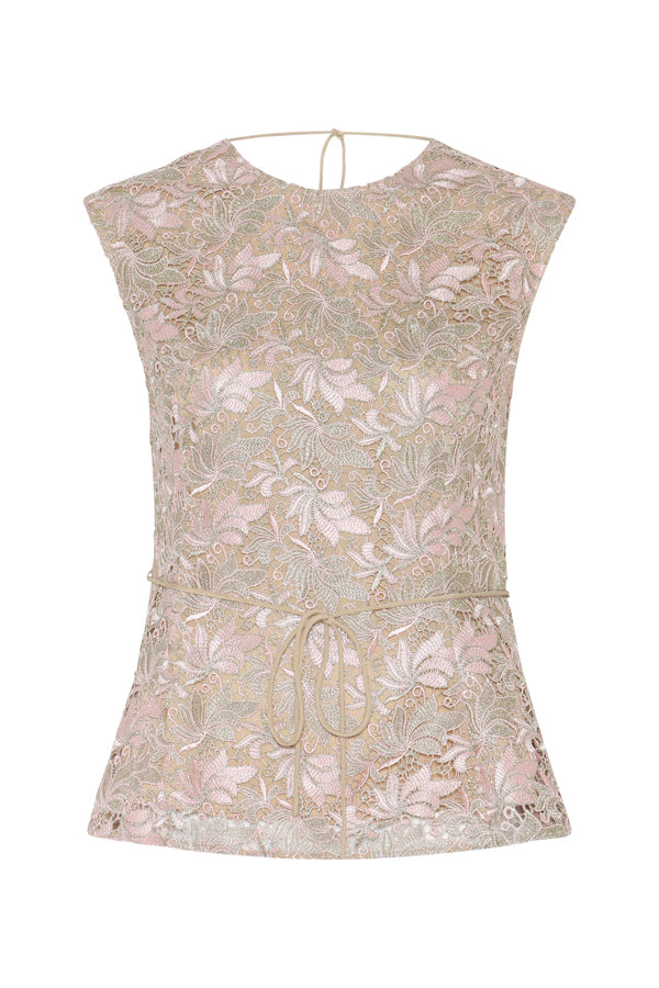 Deze verfijnde kanten top straalt pure elegantie uit en is een prachtige keuze voor zowel feestelijke als stijlvolle dagelijkse looks. Het model is uitgevoerd in een rijk geborduurde kantkwaliteit met een romantisch bloemenmotief in zachte rosé- en goudtinten, wat zorgt voor een luxe en vrouwelijke uitstraling.