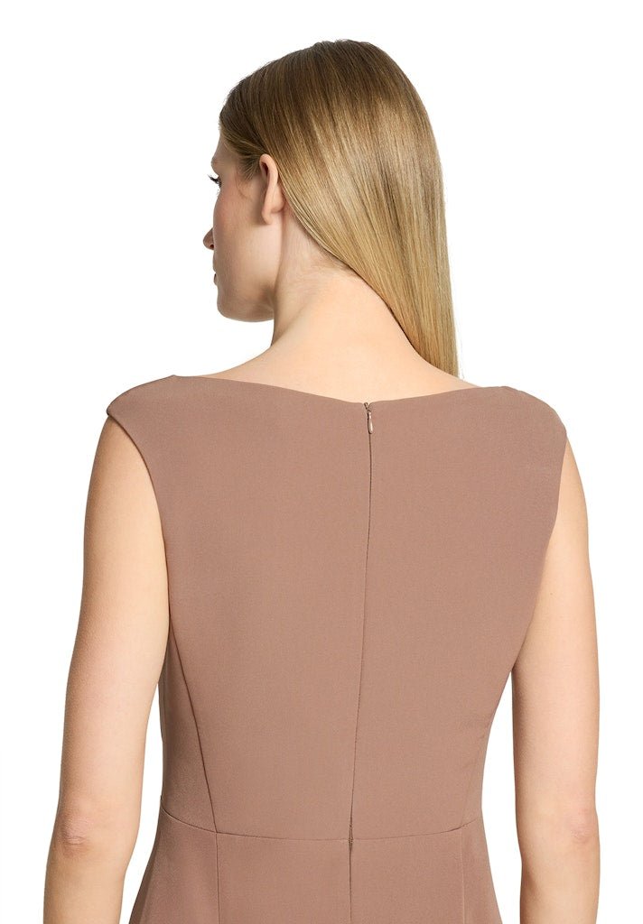 De jurk valt net op of rond de knie en is gemaakt van een soepele, kwalitatieve stof die mooi in model blijft. Dankzij het minimalistische design is deze jurk zeer veelzijdig en geschikt voor zowel zakelijke gelegenheden als feestelijke momenten zoals een diner, bruiloft of receptie. De blinde ritssluiting aan de achterzijde zorgt voor een nette afwerking.