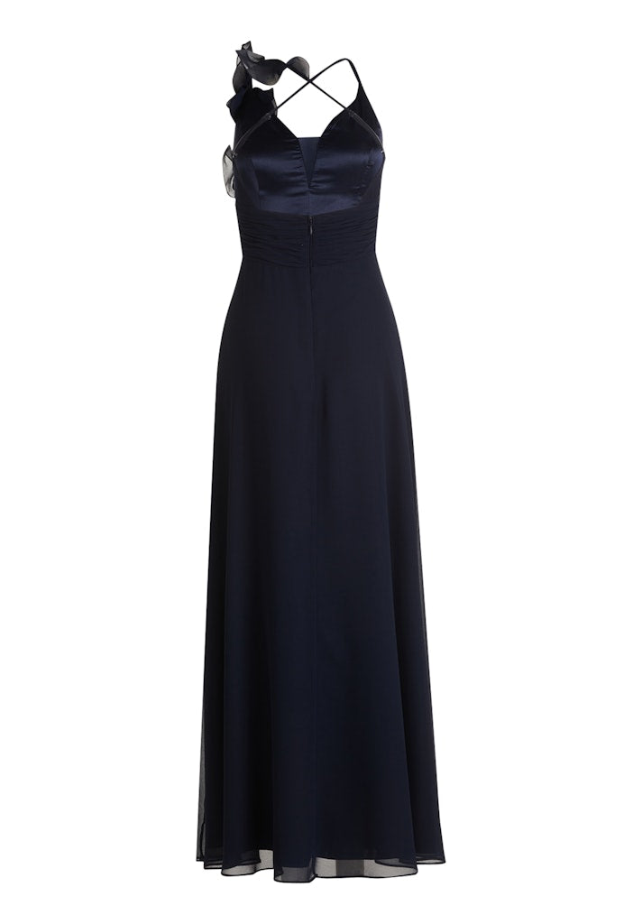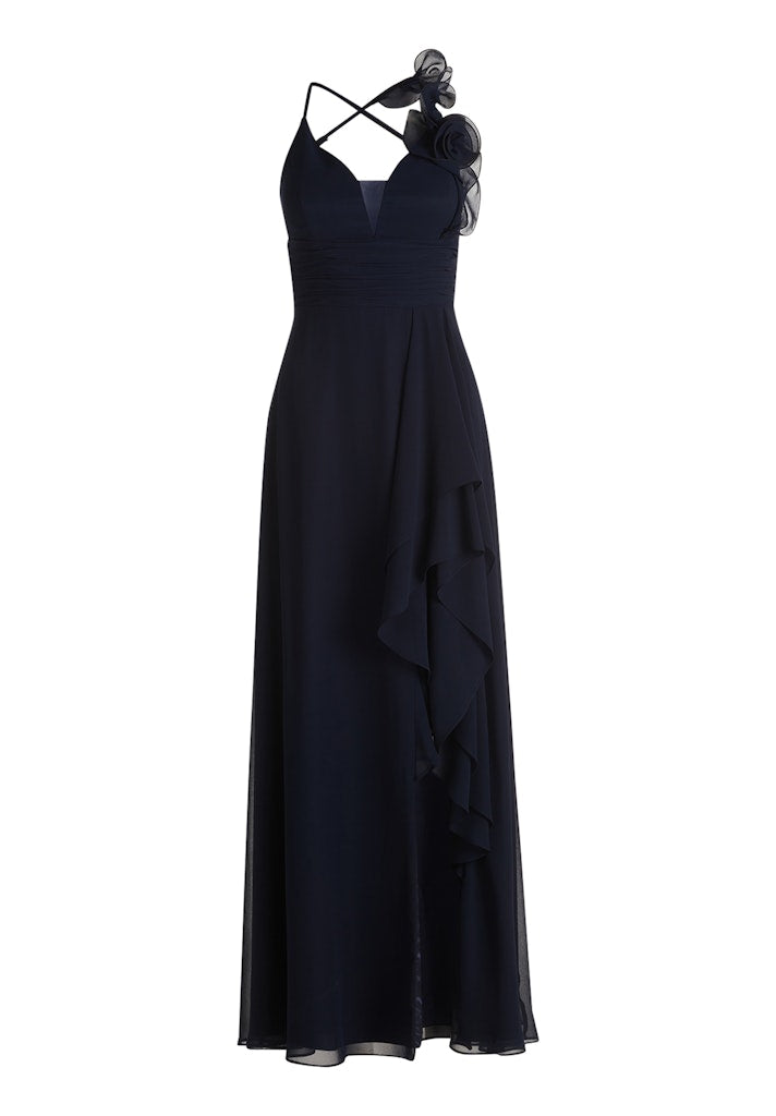 Deze elegante gala jurk is een tijdloze keuze voor bijzondere gelegenheden zoals een bruiloft, gala of formeel avondfeest. Het verfijnde ontwerp combineert een vrouwelijke V-hals met fijne, gekruiste schouderbandjes die zorgen voor een elegante en lichte uitstraling. Op één schouder is de jurk afgewerkt met een subtiele organza bloem, wat een chique en exclusief detail toevoegt.