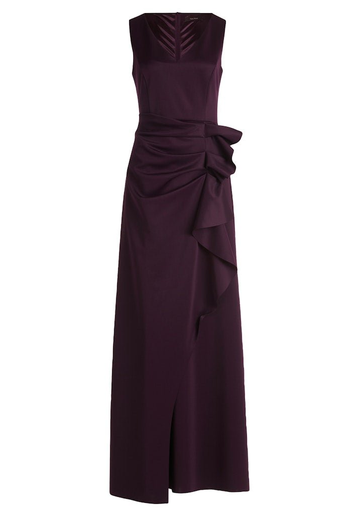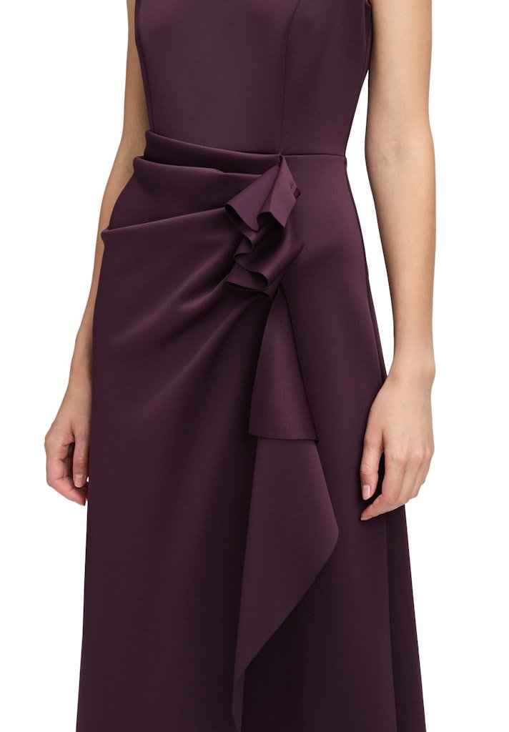 Deze stijlvolle avondjurk van Vera Mont combineert eenvoud met verfijnde details. De diepe auberginekleur geeft de jurk een luxe uitstraling, terwijl de elegante V-hals en mouwloze snit zorgen voor een tijdloze, vrouwelijke look.