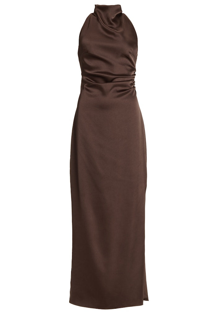 De top is subtiel gedrapeerd en sluit mooi aan rond de hals, terwijl de open rug een sensuele en stijlvolle touch toevoegt. De licht getailleerde pasvorm benadrukt het figuur op een flatterende manier en loopt uit in een lange, vloeiende rok met een elegante split voor extra bewegingsvrijheid en allure.