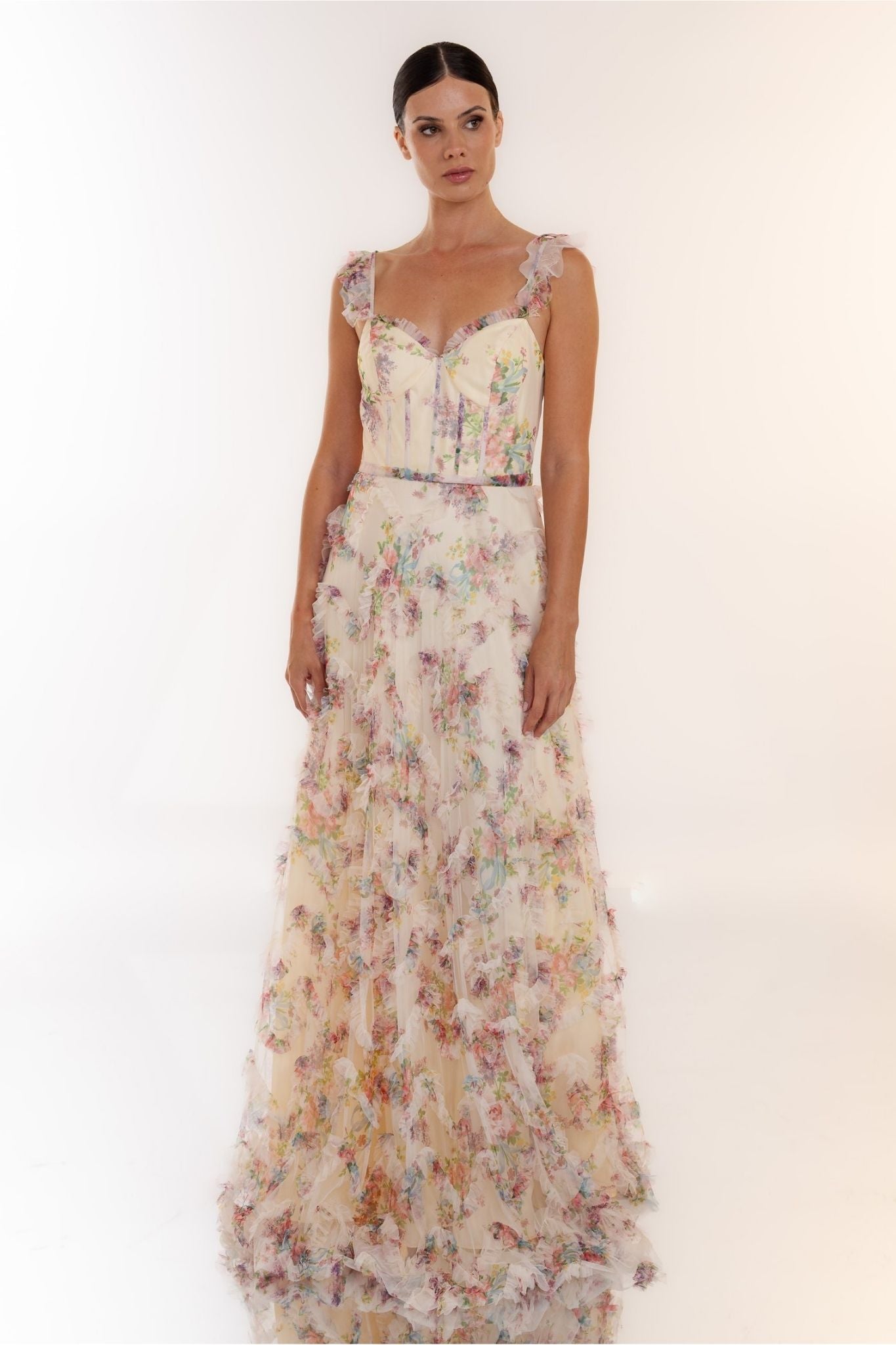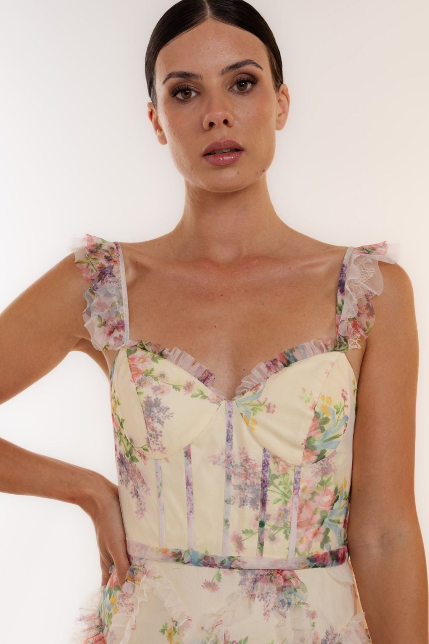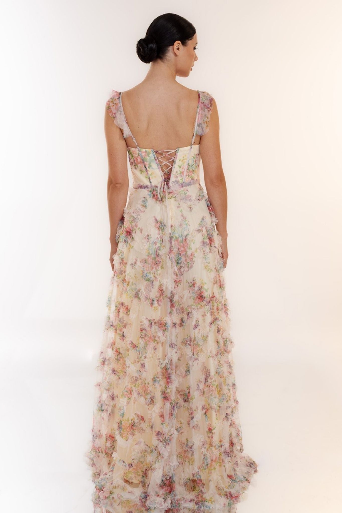 Deze romantische gala jurk van Laona straalt pure elegantie en verfijning uit. De jurk is uitgevoerd in een zachte, licht doorschijnende stof met een delicate bloemenprint in pastelkleuren, wat zorgt voor een frisse en vrouwelijke uitstraling. Het aansluitende corsetachtige lijfje met subtiele baleinen geeft extra ondersteuning en vormt het silhouet op een prachtige manier.