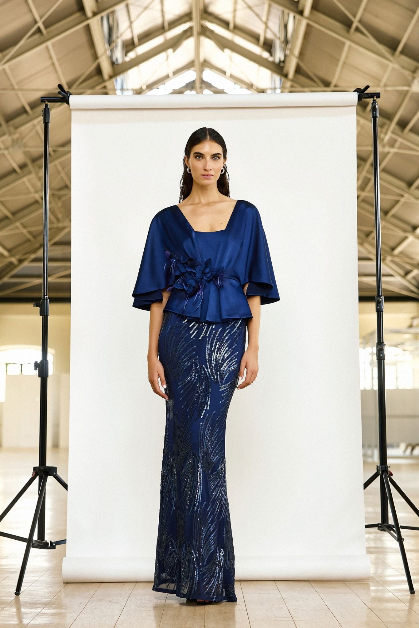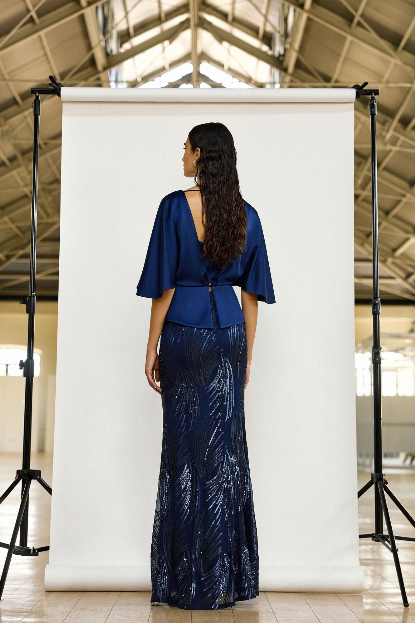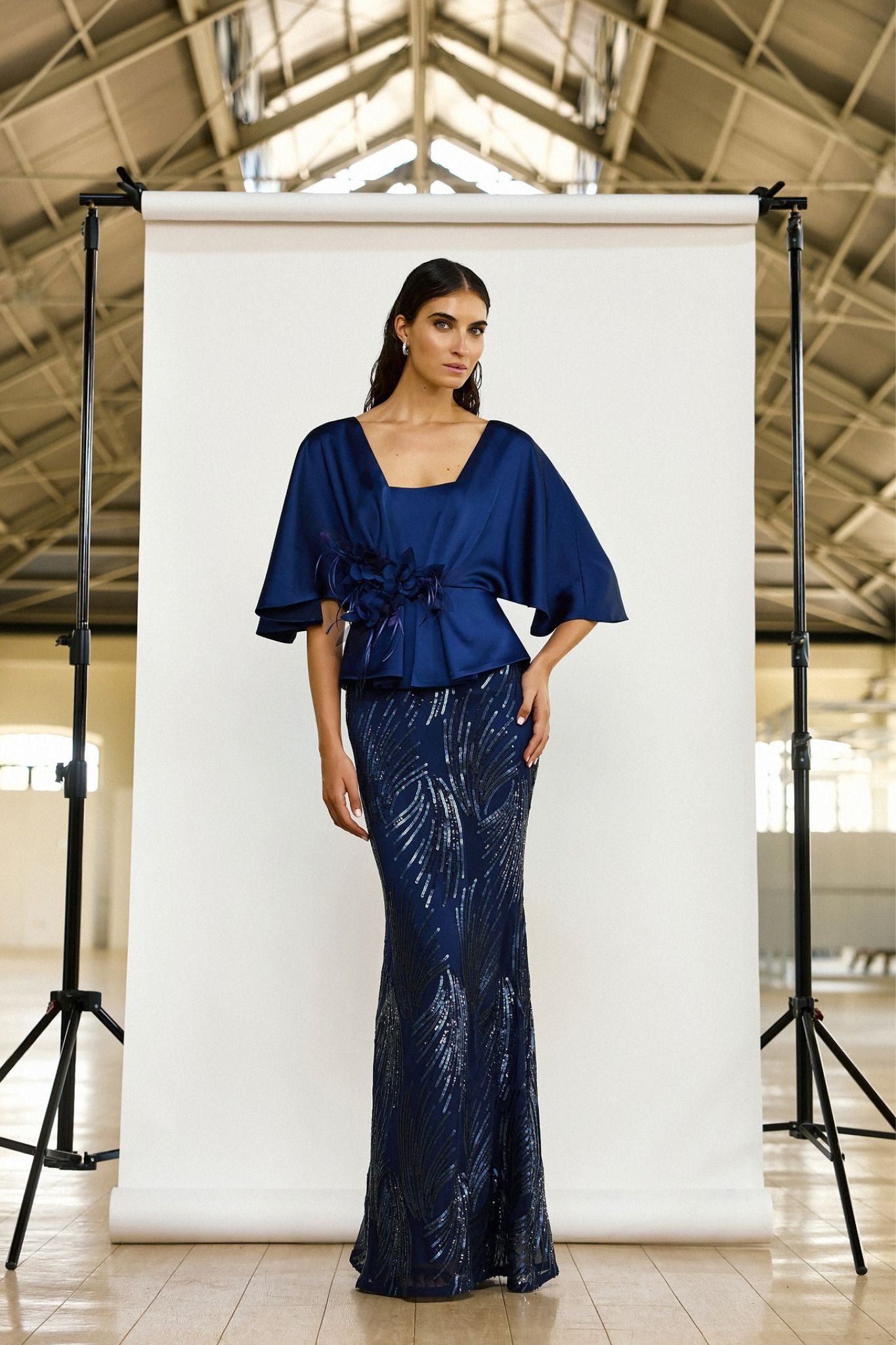 De set bestaat uit een elegante satijnen top met cape-achtige mouwen en een lange rok met verfijnde paillettenborduursels. Samen creëren deze twee stukken een luxueuze en harmonieuze uitstraling die zowel modern als tijdloos is.