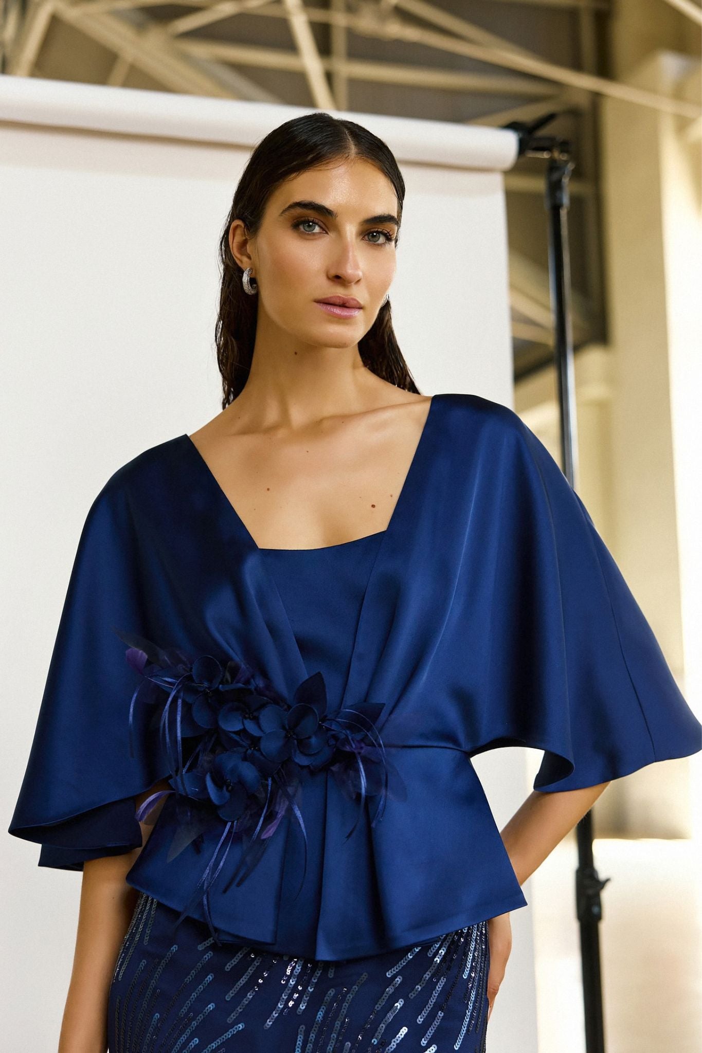 De top is uitgevoerd in een rijke navy satijn die prachtig het licht vangt en een zachte glans geeft. De wijde, vloeiende mouwen zorgen voor een elegante en flatterende vorm rond de schouders en armen. In de taille wordt de top geaccentueerd door een prachtige handgemaakte bloemenapplicatie, die het ontwerp een couture uitstraling geeft en het silhouet subtiel benadrukt.