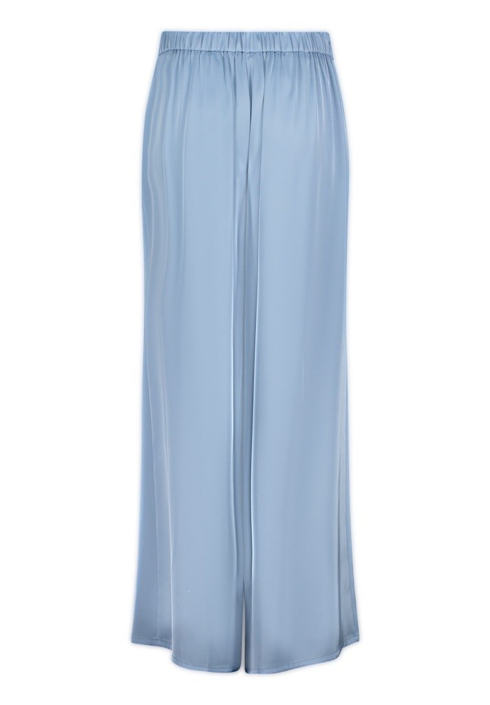 Deze elegante satijnen pantalon straalt luxe en verfijning uit. De soepelvallende satijnstof heeft een subtiele glans en zorgt voor een prachtige, vloeiende beweging bij elke stap. De pantalon is uitgevoerd met een comfortabele tailleband en wijde, rechte pijpen die het silhouet verlengen en een flatterende pasvorm creëren.