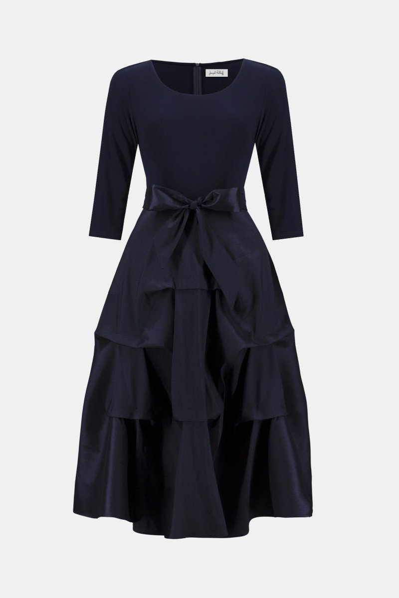 Deze elegante navy jurk van Joseph Ribkoff straalt tijdloze klasse en verfijning uit. De jurk heeft een aangesloten top met een ronde halslijn en driekwart mouwen, die zorgen voor een flatterend en comfortabel silhouet. De taille wordt geaccentueerd door een bijpassende strikceintuur, wat een vrouwelijk en elegant accent toevoegt.