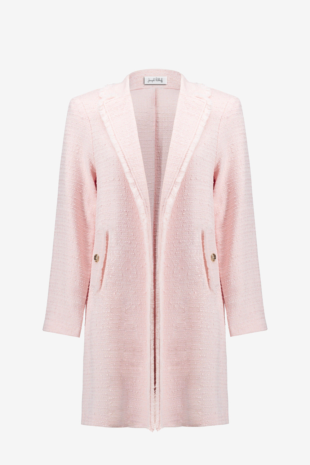 De lichtroze bouclé stof geeft de jas een romantische, high-fashion uitstraling, terwijl de zorgvuldig geplaatste franje rond de revers en voorzijde zorgt voor een speels maar chic accent. De gouden knoopdetails aan de zakken voegen een vleugje glamour toe zonder te overdrijven.