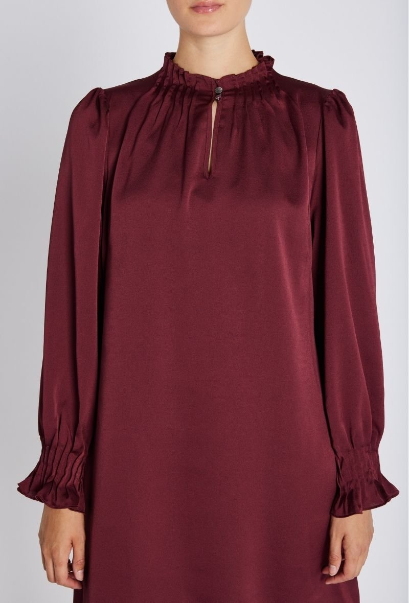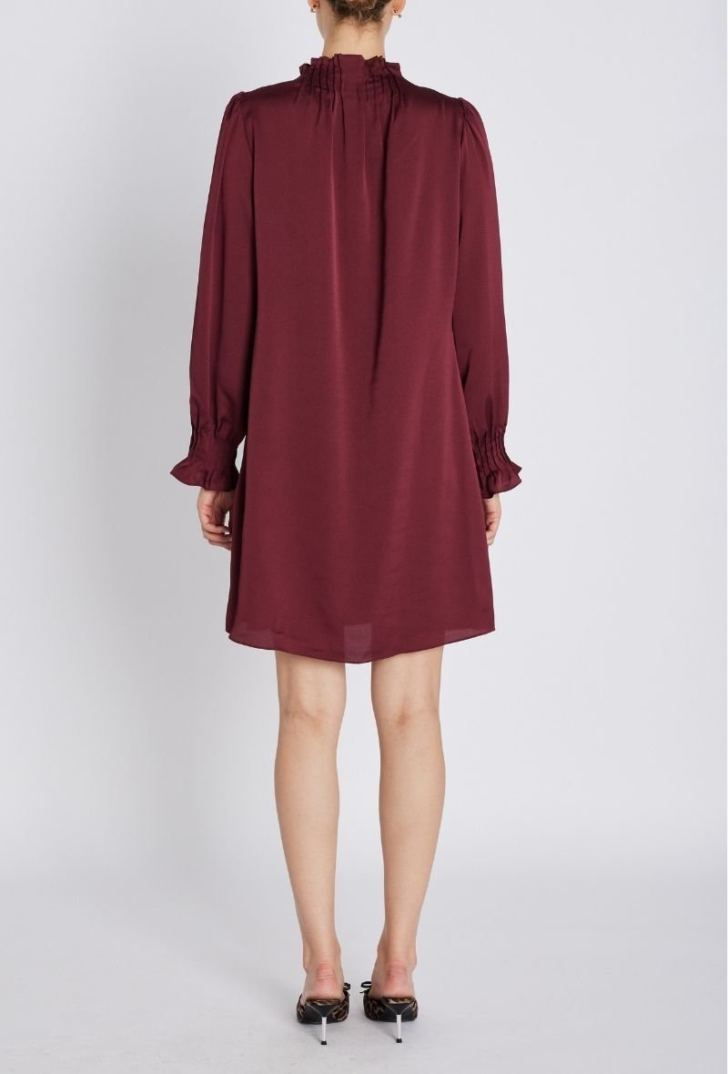 Deze elegante jurk van Bruuns Bazaar straalt tijdloze klasse uit. De rijke bourgondische kleur en de subtiele glans van de stof geven de jurk een luxe uitstraling. De losvallende pasvorm zorgt voor ultiem draagcomfort, terwijl de lange mouwen met geplooide manchetten en de gerimpelde opstaande kraag de jurk een vrouwelijke en verfijnde touch geven.