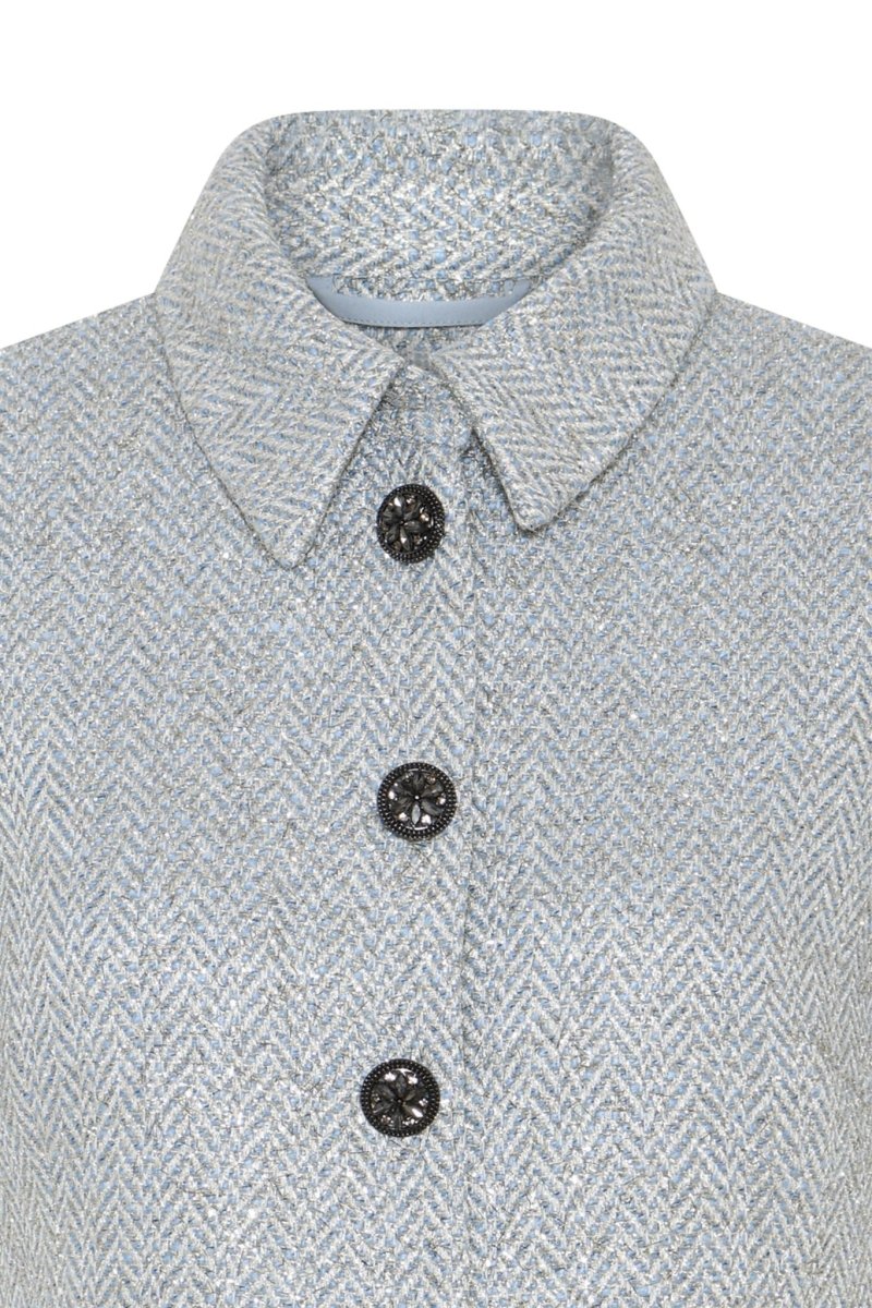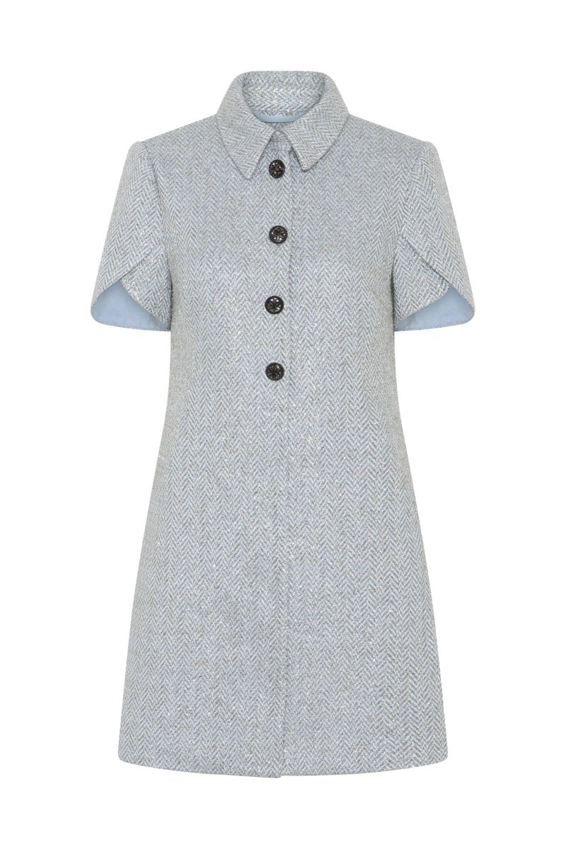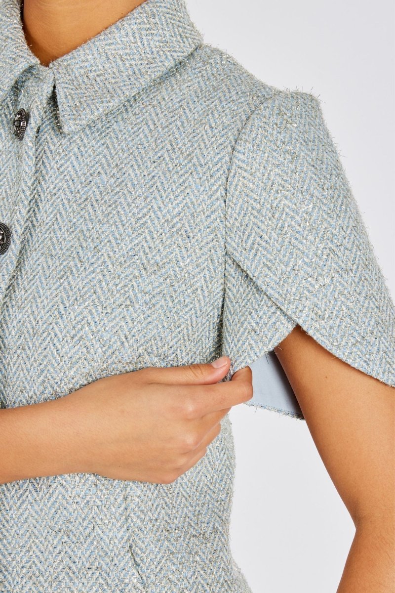 Geef je garderobe een stijlvolle upgrade met deze elegante lichtblauwe mini jurk. Gemaakt van een luxe tweedstof met een subtiel visgraatpatroon, straalt deze jurk tijdloze klasse en verfijning uit. De korte mouwen hebben een unieke overslagdetail dat zorgt voor een moderne twist op een klassiek silhouet.