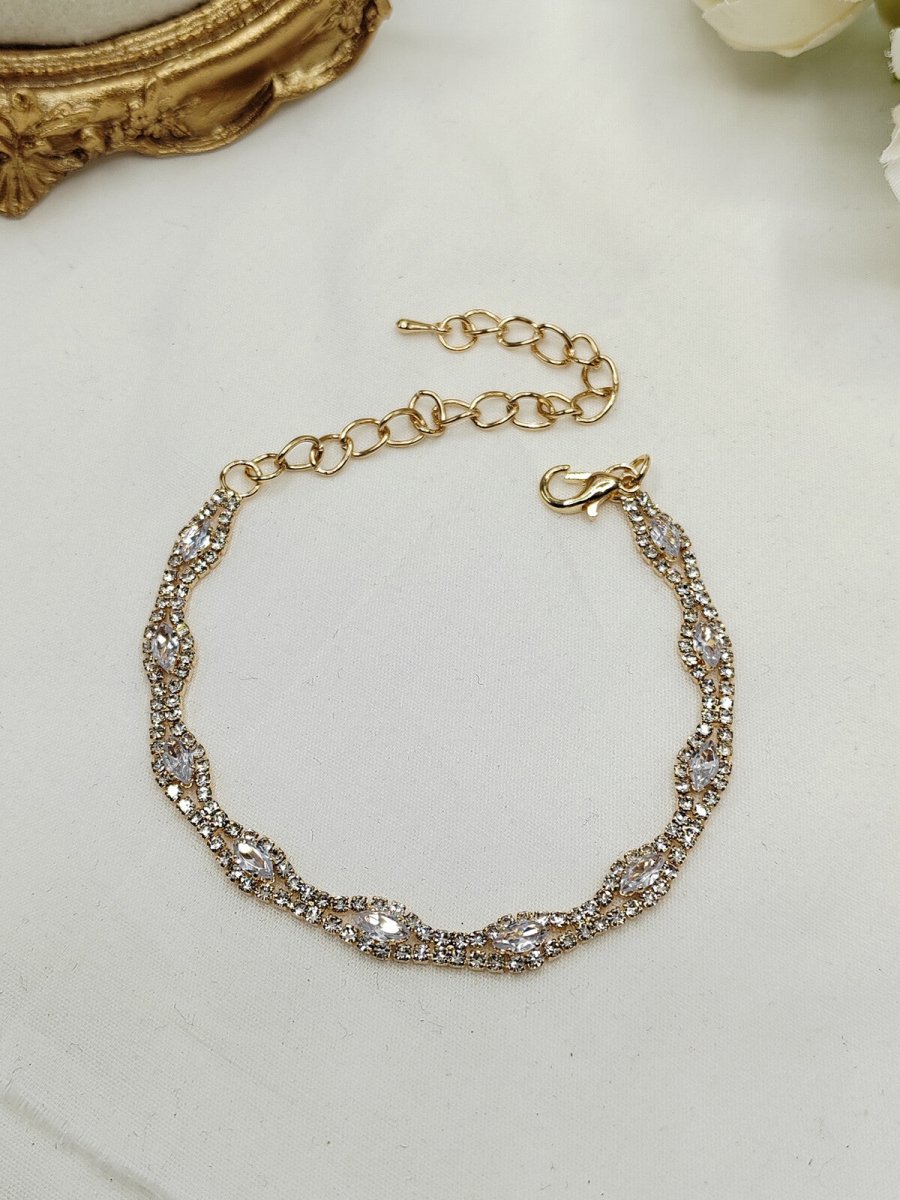 De armband heeft een golvend design met ingelegde marquise-vormige steentjes die zorgen voor een luxueuze uitstraling. Het verstelbare kettinkje en de stevige sluiting zorgen voor een perfecte pasvorm om elke pols.