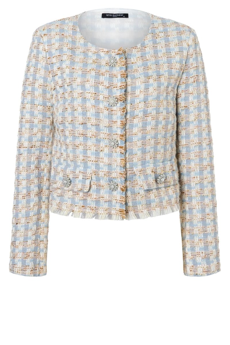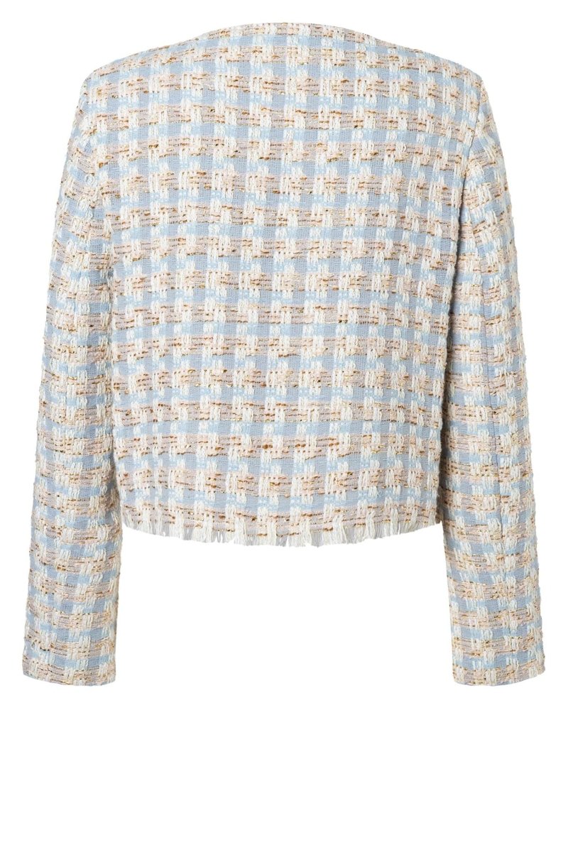 Dit elegante bouclé jasje heeft een luxe en verfijnde uitstraling dankzij de zachte structuurstof en subtiele metallic accenten. De frisse lichtblauwe tint wordt prachtig gecombineerd met off-white en goudkleurige details, wat zorgt voor een chique en tijdloze look. De ronde hals en korte, licht getailleerde pasvorm geven het jasje een vrouwelijke en moderne uitstraling.