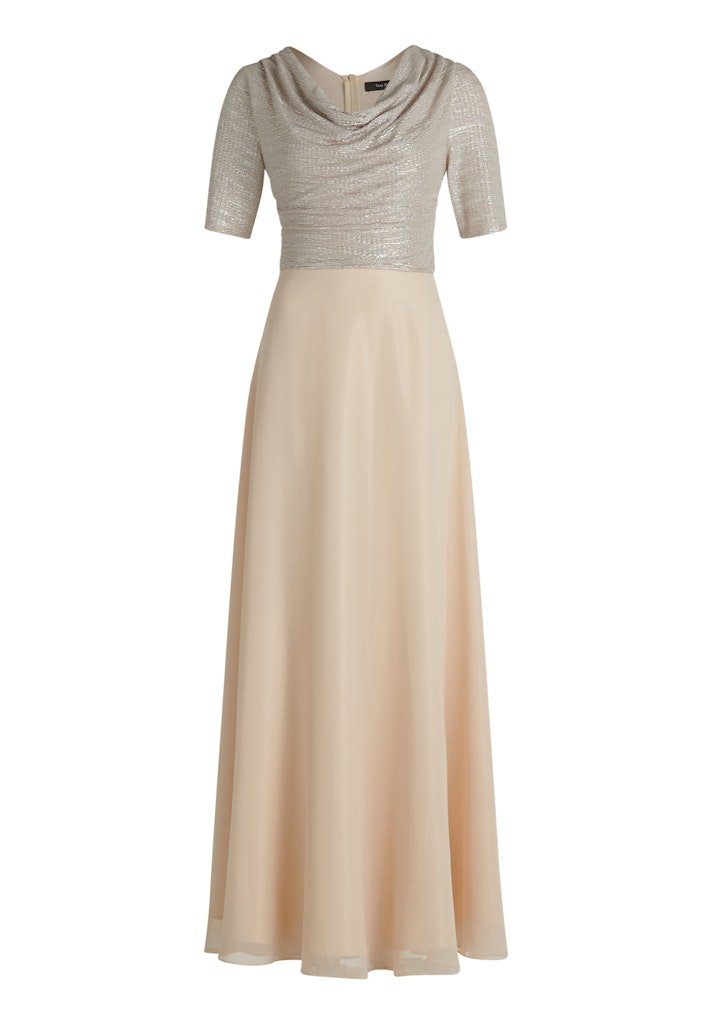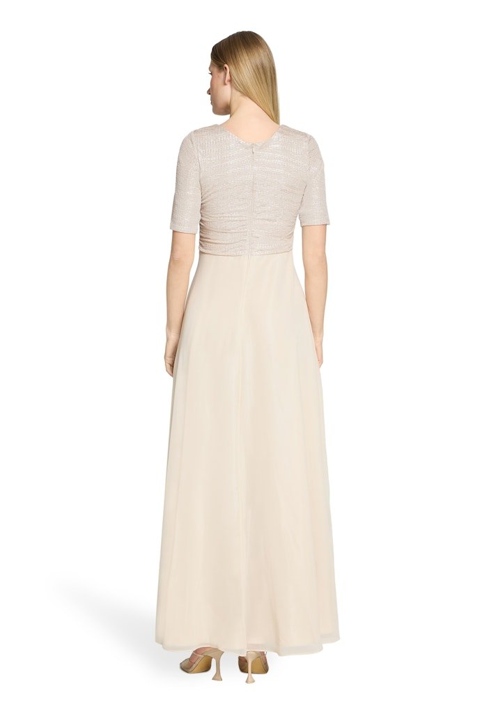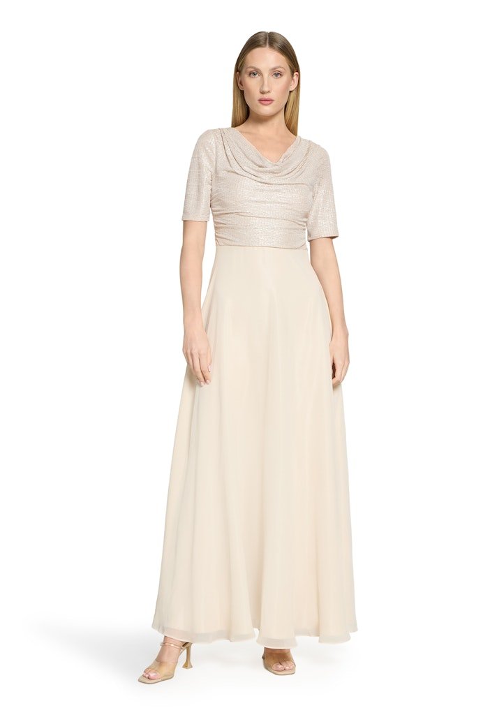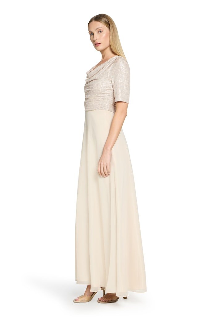 Deze elegante avondjurk straalt tijdloze klasse en verfijnde vrouwelijkheid uit. De jurk is uitgevoerd in een zachte champagne-/beigetint en combineert een subtiel glanzend bovenlijf met een soepel vallende, lange rok.