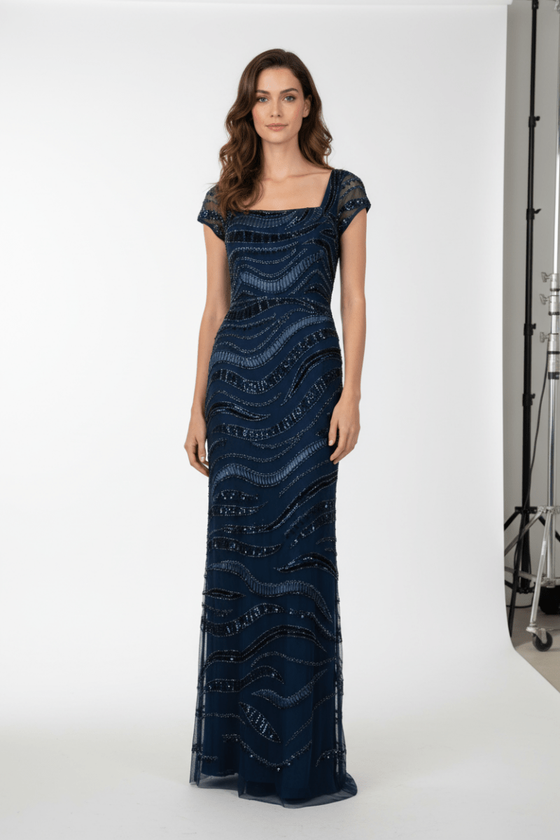Deze elegante avondjurk van Adrianna Papell straalt pure klasse en verfijning uit. De jurk is vervaardigd uit een luxe meshlaag met handgemaakte pailletten en kralen die in golvende patronen over het hele silhouet lopen. De diepe blauwtonen geven de jurk een tijdloze, chique uitstraling, terwijl de subtiele glans van de beading prachtig vangt bij iedere beweging – perfect voor gala’s, formele diners of feestelijke events.