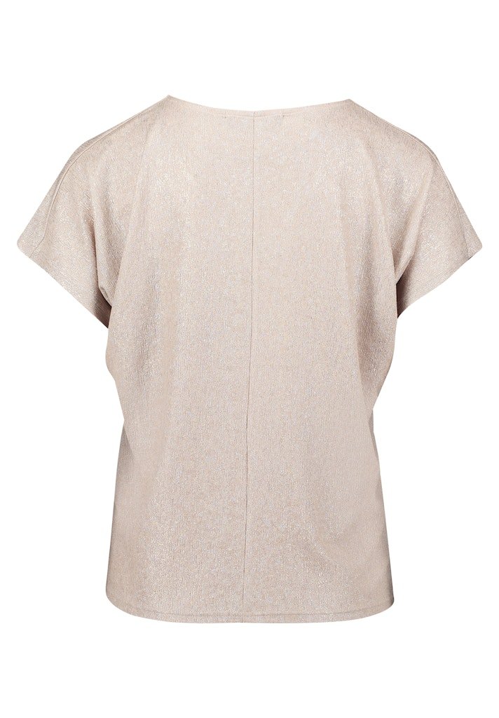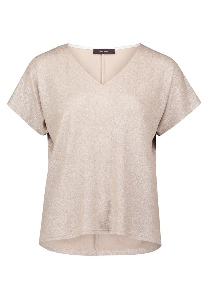 Stijlvol en modern – deze champagnekleurige top van Vera Mont is een echte blikvanger. Het subtiele glansmateriaal geeft de top een luxe uitstraling, ideaal voor feestelijke gelegenheden of een chique avondje uit. De V-hals en korte, losvallende mouwen zorgen voor een elegante en comfortabele pasvorm.