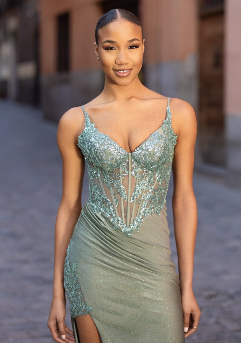 Deze verfijnde avondjurk in Glitter Sage Green combineert romantiek en elegantie op een unieke manier. Het lijfje heeft een transparante illusie basis met verfijnde kanten appliqués en glitterdetails, die prachtig overlopen in een soepel vallende rok. De slanke spaghettibandjes en diepe V-halslijn zorgen voor een vrouwelijke uitstraling, terwijl de hoge split aan de zijkant een sensuele touch toevoegt.