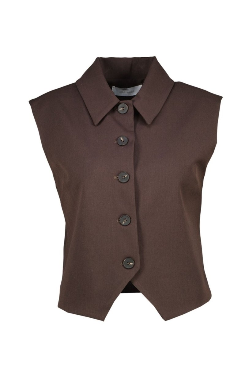 De Madison Gilet Choco van Amélie & Amélie is een stijlvolle en moderne toevoeging aan je garderobe. Dit mouwloze gilet in een diepe chocoladetint straalt klasse en verfijning uit dankzij zijn strakke snit en klassieke kraag. De rij van knopen aan de voorzijde en de subtiele tailleaccentuering zorgen voor een flatterend silhouet met een tijdloze uitstraling.
