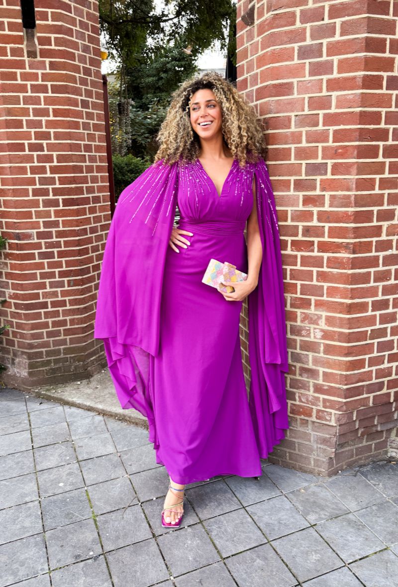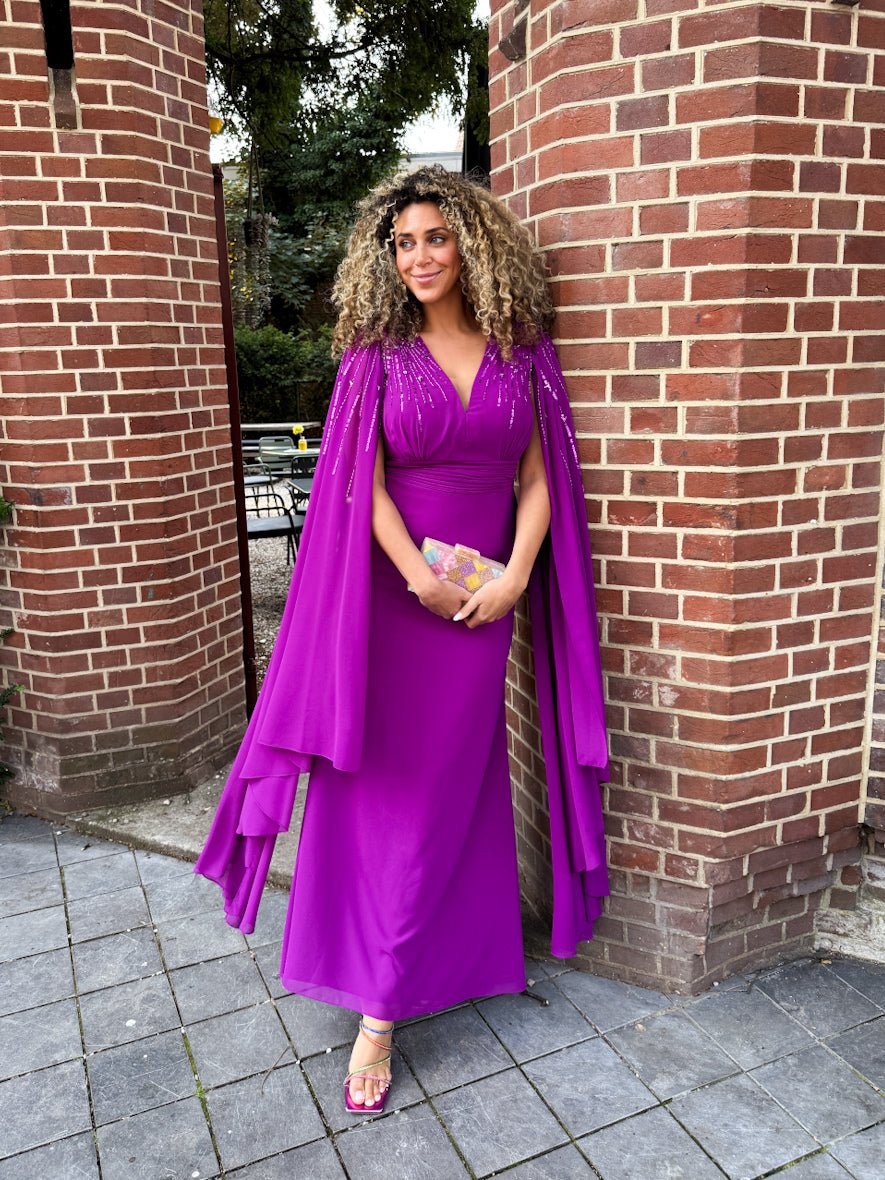 Laat een onvergetelijke indruk achter met deze adembenemende avondjurk van Sonia Peña in de kleur Buganvilla. Deze fuchsia-paarse blikvanger combineert een verfijnde pasvorm met een krachtige uitstraling. De diepe V-hals en sierlijk gedrapeerde taille zorgen voor een vrouwelijk silhouet, terwijl de dramatische cape-mouwen met fonkelende strasdetails een glamourous statement maken.