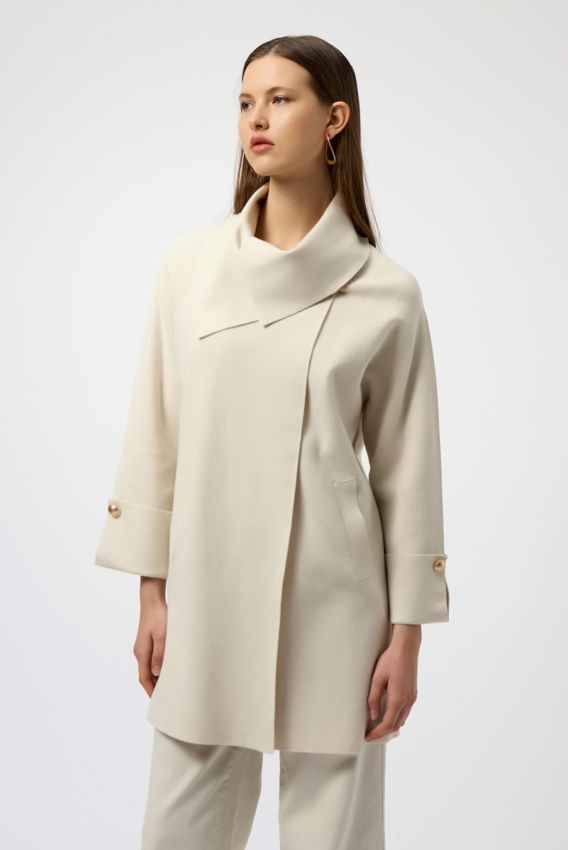 De rechte snit valt soepel om het lichaam, terwijl de opgestikte zakken en de omgeslagen mouwen met knoopdetail de jas een subtiel karakter geven. Dankzij de lengte is dit model ideaal om te dragen over zowel broeken als jurken, waardoor het een veelzijdige toevoeging is aan elke garderobe.