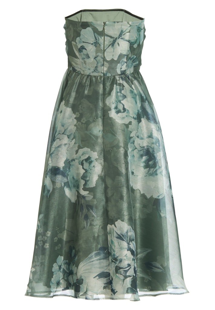 Gemaakt van luchtige organza met een subtiele glans, combineert deze jurk comfort met stijl. De bloemige print in zachte groentinten met accenten van blauw en crème zorgt voor een romantische, natuurlijke uitstraling die moeiteloos de aandacht trekt. Dankzij de ingewerkte tailleband wordt het silhouet mooi geaccentueerd, waardoor je figuur extra tot zijn recht komt.