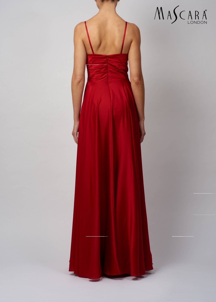 Satinkleid mit hohem Schlitz, V-Ausschnitt und Spaghettiträgern. Ein Kleid, das sowohl für Brautjungfern als auch für eine schöne Gala geeignet ist.