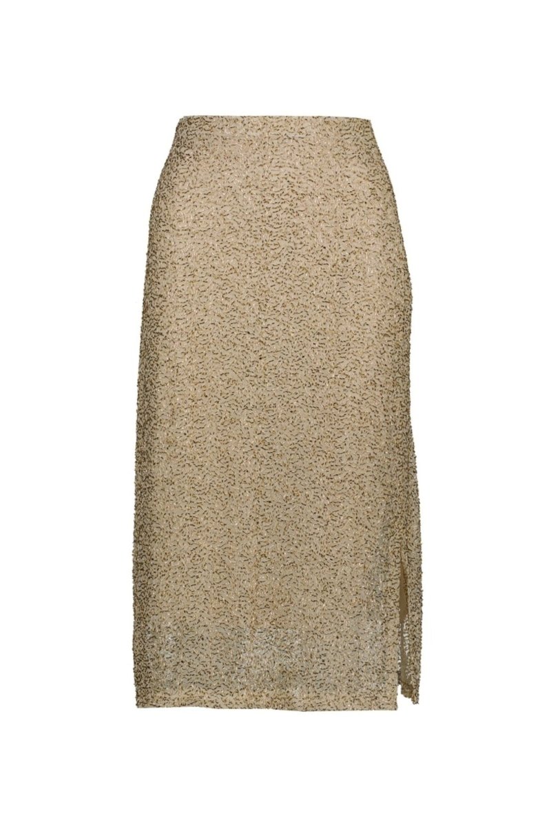 De Napuka rok van Amélie & Amélie straalt pure elegantie uit. Deze goudkleurige midi-rok is vervaardigd uit een glanzende, licht transparante stof met subtiele textuur, wat zorgt voor een luxueuze en feestelijke uitstraling. De rechte pasvorm en de zijsplit creëren een vrouwelijk silhouet dat moeiteloos combineert met zowel chique blouses als fijne knitwear.