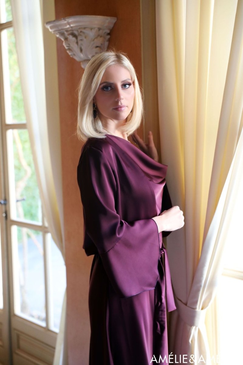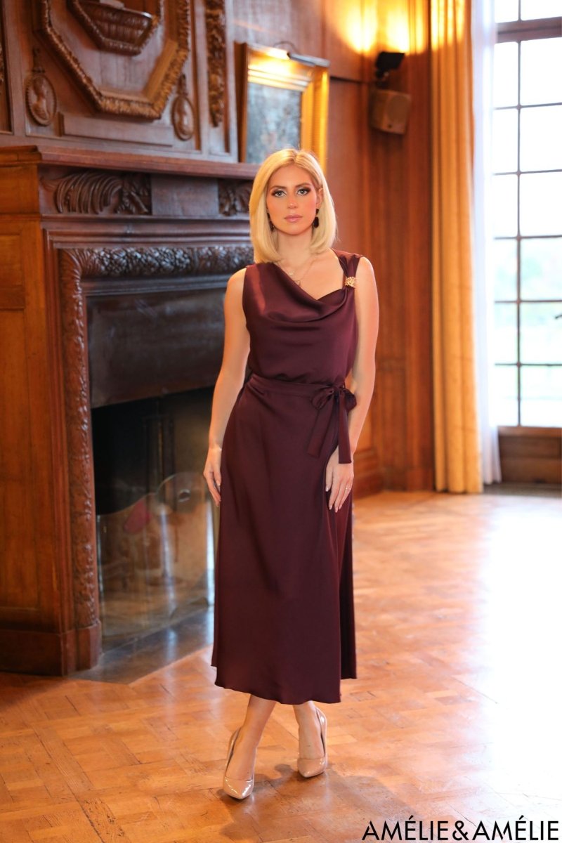 De Nolana jurk van Amélie & Amélie straalt pure elegantie uit. Deze luxueuze satijnen jurk heeft een vloeiend vallende stof met een subtiele glans, wat zorgt voor een verfijnde en vrouwelijke uitstraling. De watervalhalslijn accentueert het decolleté op een elegante manier, terwijl de bijpassende ceintuur de taille prachtig benadrukt.