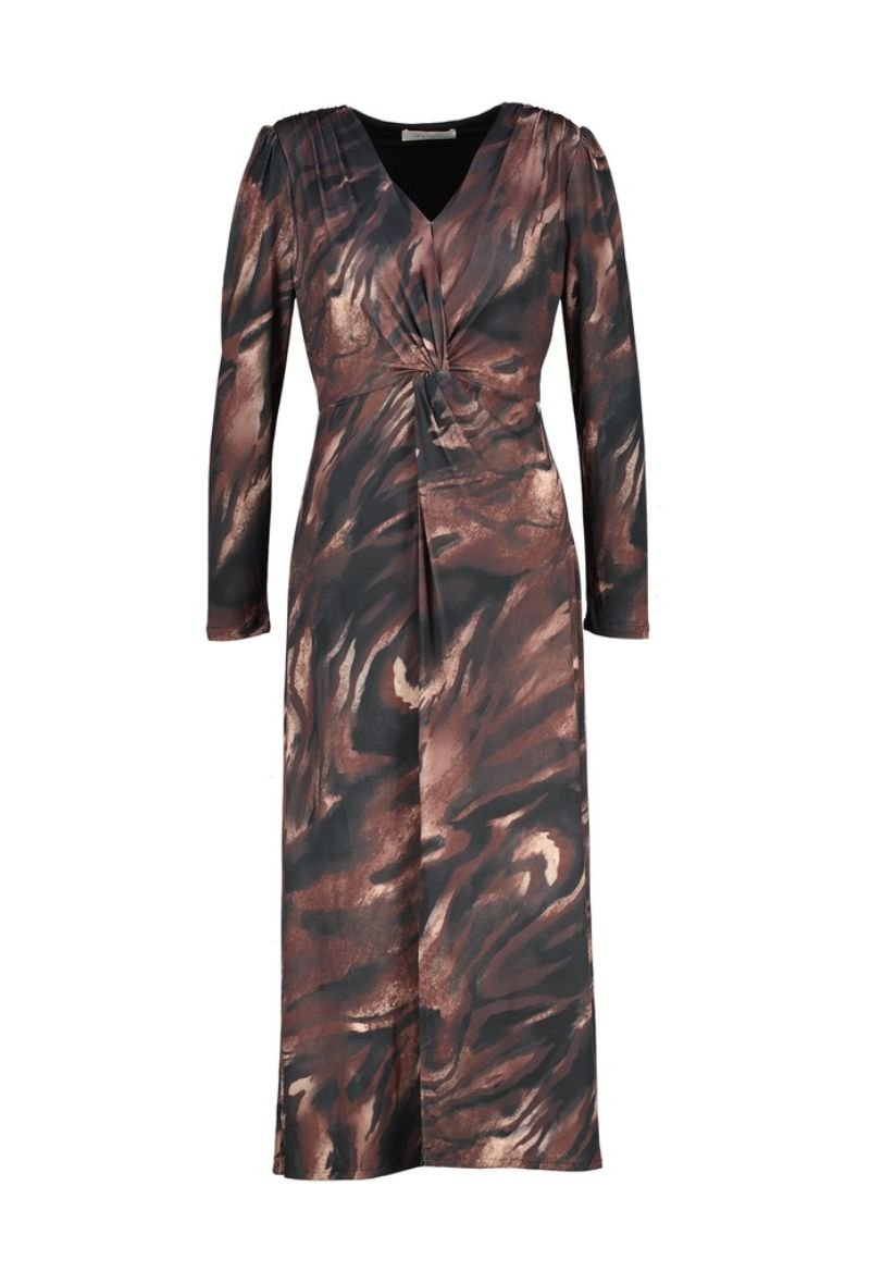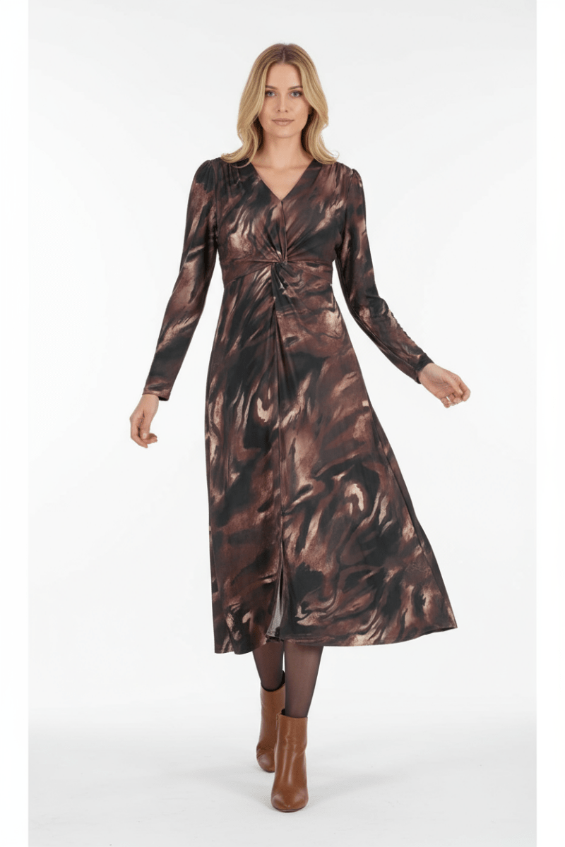 De Egle dress van Amélie & Amélie is een elegante verschijning met een moderne, chique uitstraling. De chocoladebruine tinten gecombineerd met het unieke, abstracte dessin geven de jurk een verfijnde en stijlvolle look.