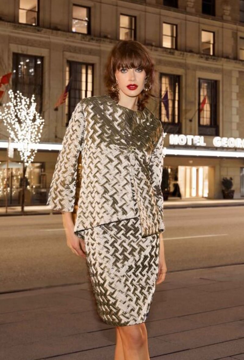 Laat je betoveren door deze chique en verfijnde set van Frank Lyman, bestaande uit een elegante jurk met bijpassend los jasje. De set is uitgevoerd in een opvallende geweven metallic print in tinten van goud, wat zorgt voor een luxe uitstraling.