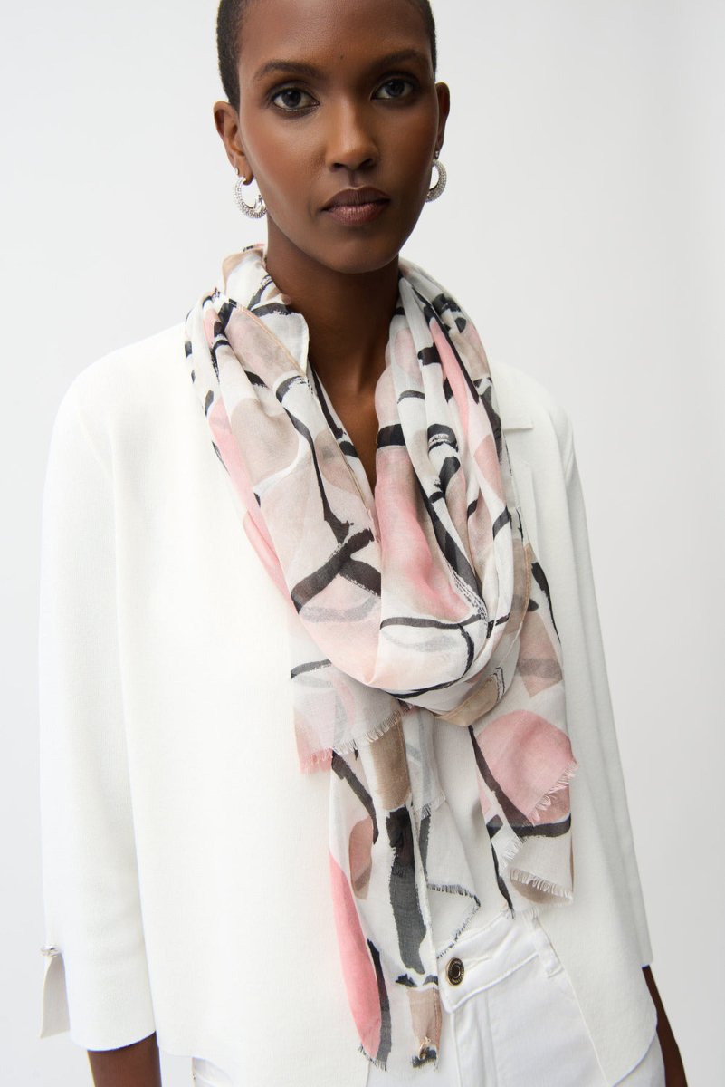 Voeg een vleugje elegantie en kleur toe aan elke outfit met deze luchtige viscose sjaal van Joseph Ribkoff. De sjaal is versierd met een artistieke abstracte print in zachte tinten zoals blushroze, beige en zwart – een perfecte mix van vrouwelijke verfijning en moderne kunstzinnigheid.