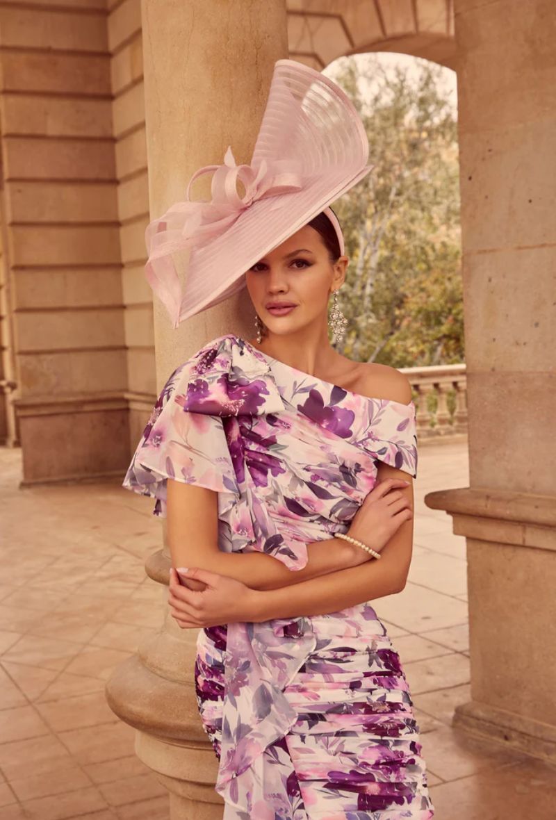 Het luchtige materiaal en de vloeiende lijnen geven deze jurk een licht romantisch karakter, terwijl de dramatische asymmetrische zoom en de speelse ruches zorgen voor een stijlvolle, moderne twist. De look wordt gecomplementeerd met een opvallende bijpassende hoed in blush roze, versierd met strikken en golvende details.