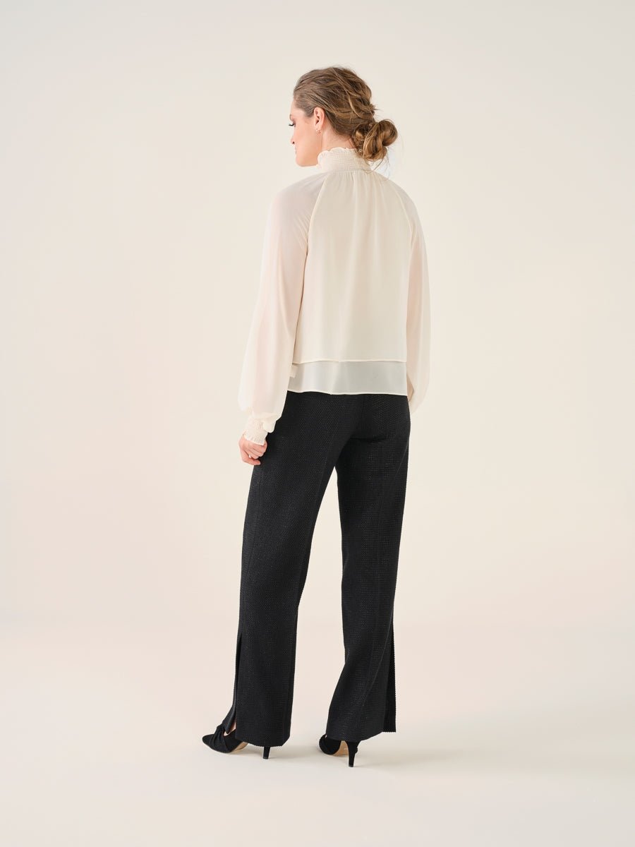 • Hoge gesmokte col met subtiele ruffle afwerking