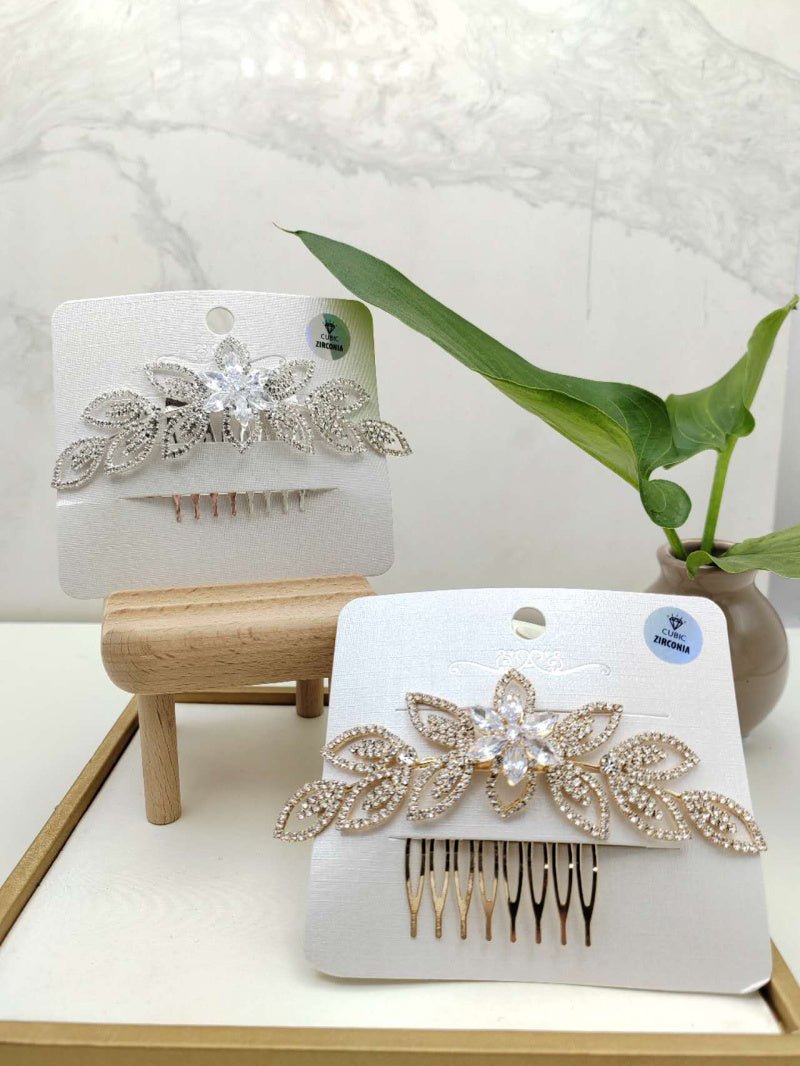 Voeg een vleugje glamour toe aan je kapsel met deze schitterende Luxe Haaraccessoire, perfect voor bruiloften, gala’s of andere speciale gelegenheden. Dit elegante haarstukje is vormgegeven als een bloeiende bloem met omliggende bladeren, rijkelijk bezet met sprankelende Cubic Zirconia steentjes voor een luxueuze uitstraling.