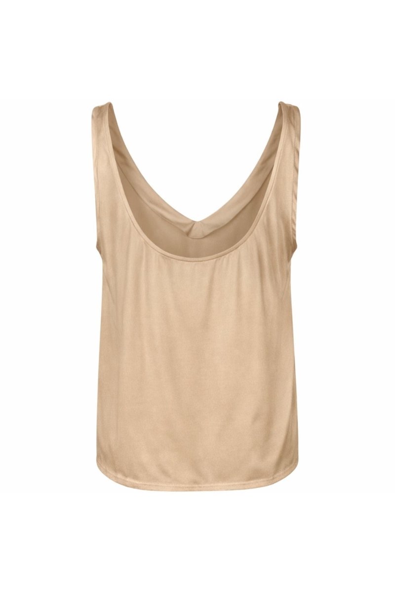 Deze verfijnde top in de kleur sand is een stijlvolle essential die luxe en comfort perfect combineert. De voorzijde is gemaakt van 100% zijde, wat zorgt voor een subtiele glans en een elegante uitstraling, terwijl de achterkant van zachte jersey (viscose met elastaan) garant staat voor een comfortabele pasvorm die mooi met het lichaam meebeweegt.