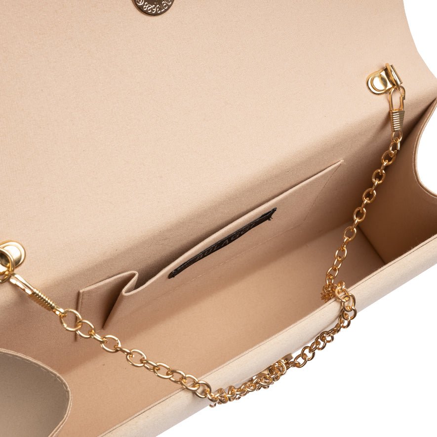 Deze vrouwelijke envelop Bow, is een grote clutch waar veel essentials in passen voor een avondje uit. Deze tas kan ook over de schouder worden gedragen dankzij de meegeleverde extra schouderriem. Aan de binnenkant heeft deze tas een hoofdcompartiment met één binnenvakje. De metaal kleur is licht goud De afmetingen (breedte / hoogte / diepte) van deze envelop zijn 23x12x4