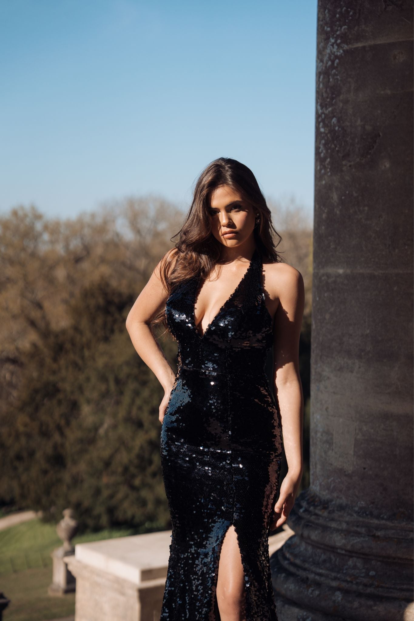 Ben je op zoek naar een zwarte pailletten galajurk met halterhals en split die elegantie en glamour moeiteloos combineert? Dan is dit de perfecte jurk voor een onvergetelijke entree.