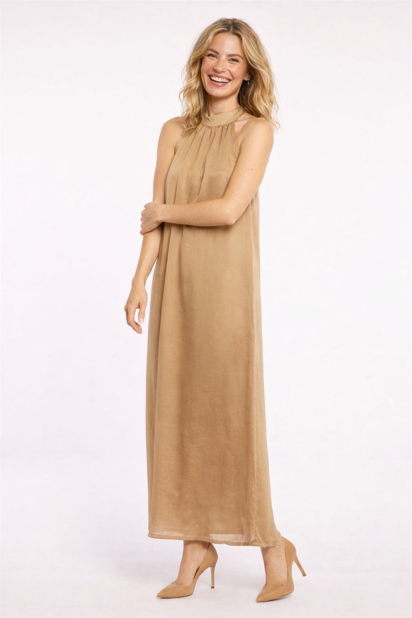 Deze elegante maxi jurk straalt pure verfijning uit dankzij het minimalistische ontwerp en de prachtig vloeiende stof. Het haltermodel met een hoge halslijn creëert een stijlvolle en moderne uitstraling, terwijl de subtiele plooien bij de hals zorgen voor een zachte, vrouwelijke valling. De jurk valt losjes langs het lichaam en beweegt soepel mee bij elke stap, wat zorgt voor een elegante en luchtige look.