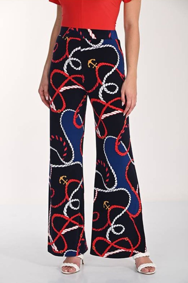 Laat je stijl spreken met deze modieuze knit broek van Frank Lyman in een opvallend maritiem dessin. De print met touwen en ankermotieven in rood, wit, blauw en goud zorgt voor een elegante en zomerse uitstraling. Dankzij de wijde pijpen en de soepele, rekbare stof biedt deze broek niet alleen een chique look, maar ook uitzonderlijk draagcomfort.