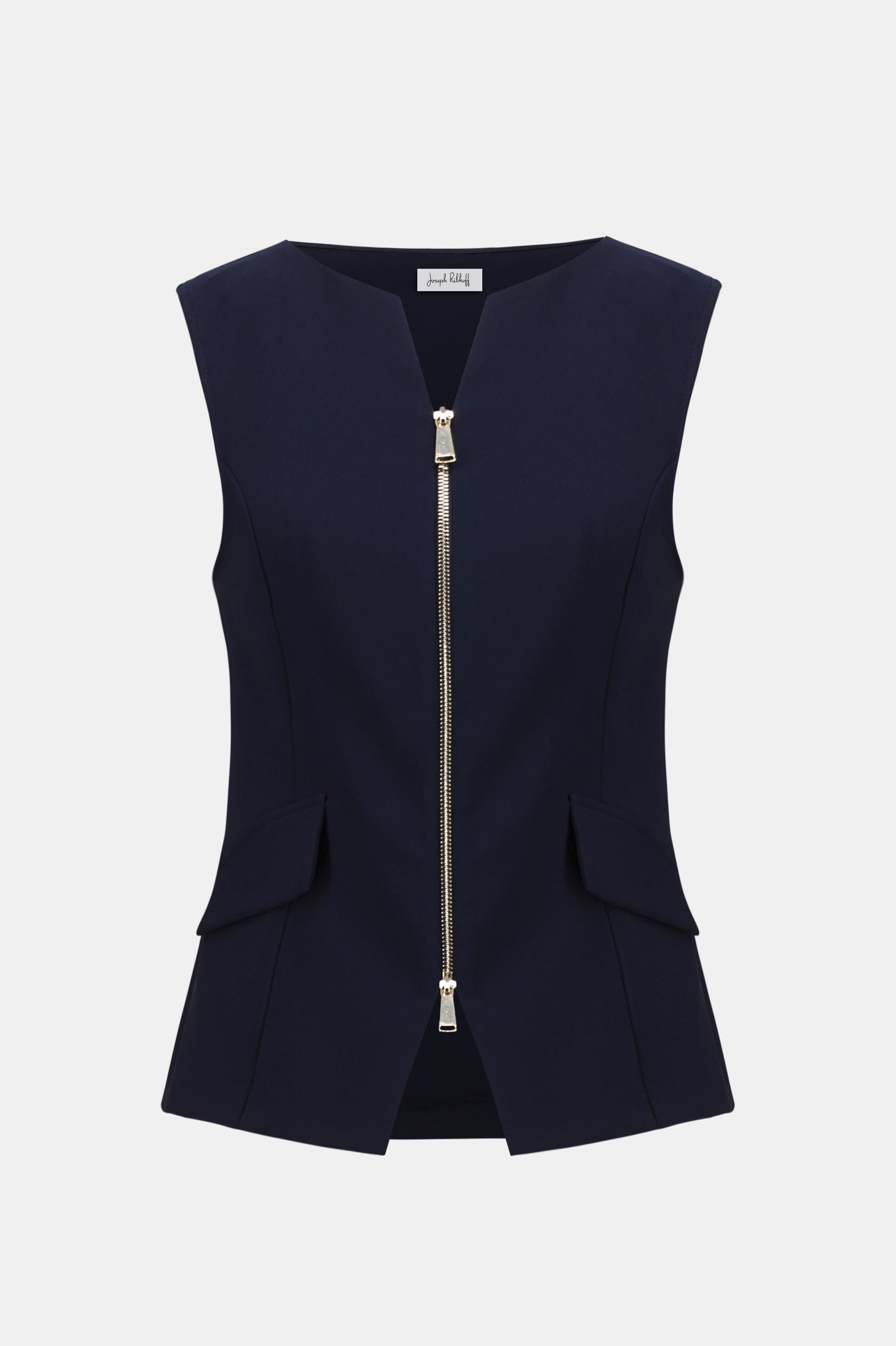 Deze elegante mouwloze blazer van Joseph Ribkoff combineert een moderne, minimalistische uitstraling met een verfijnde tailoring. Het getailleerde model volgt mooi de contouren van het lichaam en creëert een krachtig, vrouwelijk silhouet. De diepe midnight-blauwe kleur zorgt voor een tijdloze en luxe uitstraling die moeiteloos te combineren is met zowel zakelijke als stijlvolle outfits.