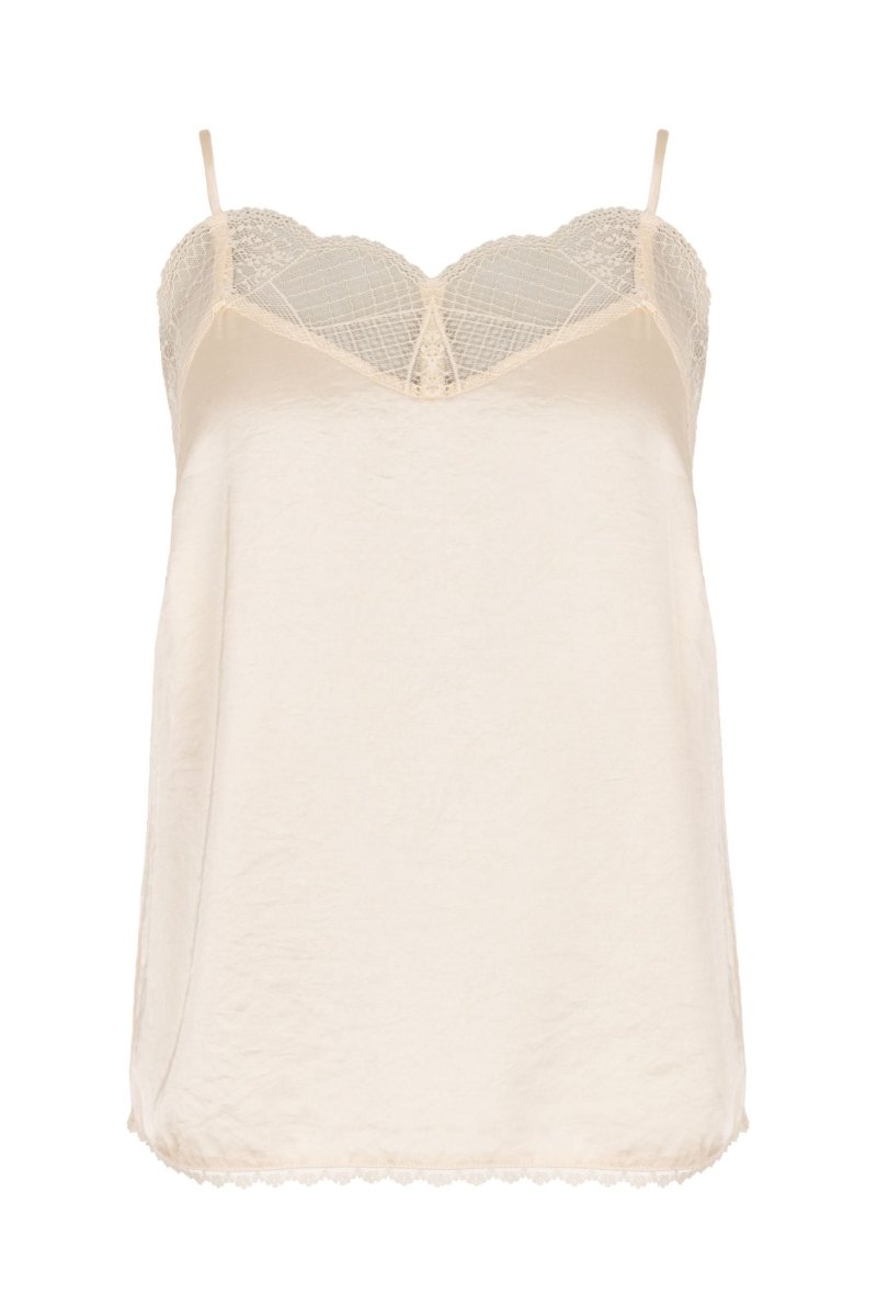 Dit elegante hemdje is de perfecte combinatie van vrouwelijkheid en comfort. Uitgevoerd in een soepel geweven satijnachtige stof met een subtiele glans, valt het prachtig langs het lichaam en voelt het heerlijk licht aan op de huid. De verfijnde kanten afwerking langs de halslijn geeft het item een romantische en luxe uitstraling.
