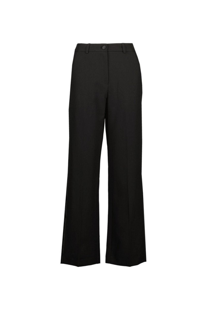 De pantalon heeft een rechte, licht uitlopende pasvorm die mooi langs het lichaam valt. Langs de zijkanten loopt een satijnen bies, die de klassieke tuxedo-stijl een moderne, vrouwelijke twist geeft. Het ontwerp is afgewerkt met een nette tailleband, riemlussen en een gladde sluiting voor een strakke, elegante uitstraling.