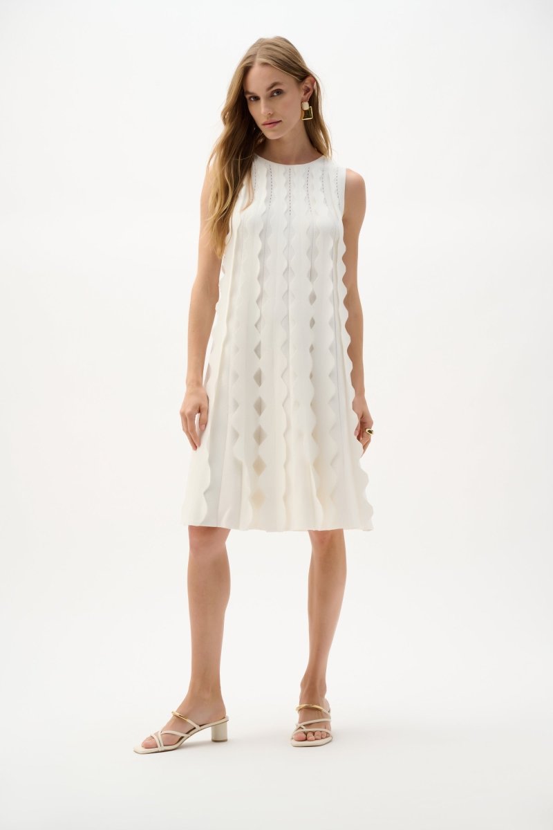 Deze mouwloze A-lijn jurk van Joseph Ribkoff is een tijdloos en elegant item met een verfijnde uitstraling. De jurk is uitgevoerd in een zachte viscose-rayon mix met nylon, wat zorgt voor een soepele valling, een licht structuureffect en een prettig draagcomfort.